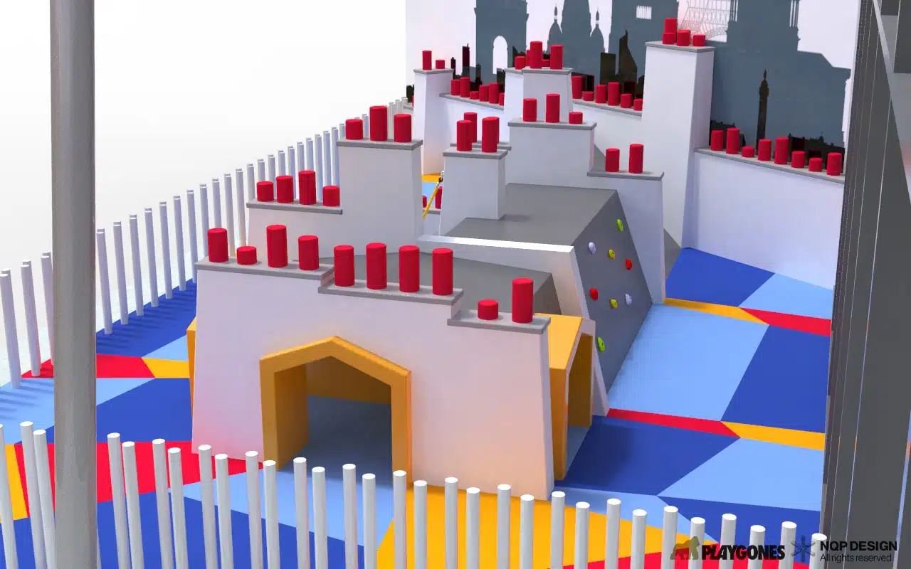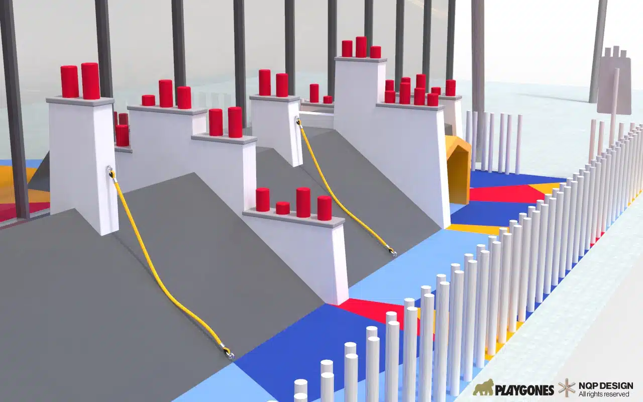 Dans cette espace ludique se retrouve ses éléments clés : pentes, chemins escarpés, cheminées et son magnifique décor intérieur représentant les toits et les célèbres monuments de la capitale. La communication entre l’extérieur et l’intérieur se fait visuellement par la continuité du décor. L’inclusion est au centre de cette proposition. Il s’agit d’une approche très design, moderne et innovante, basée sur l’adaptation motrice des enfants de tout âge et tout niveaux de capacité.
