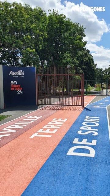 Dès l’entrée du portail, les visiteurs sont accueillis par une piste peinte au sol aux couleurs de « Terre de Jeux 2024 », bleu et rouge, avec l’inscription « Avrillé Terre de Sport ». Cette initiative reflète le statut de la commune, labellisée « Terre de Jeux » et distinguée par quatre lauriers du label « Ville active et sportive ».