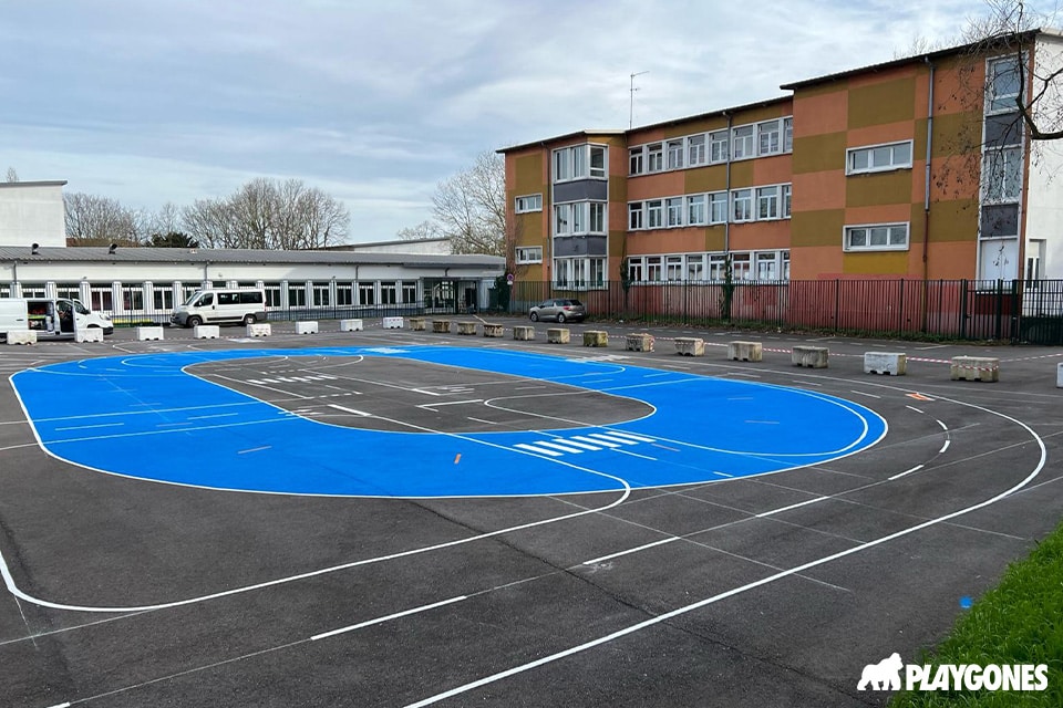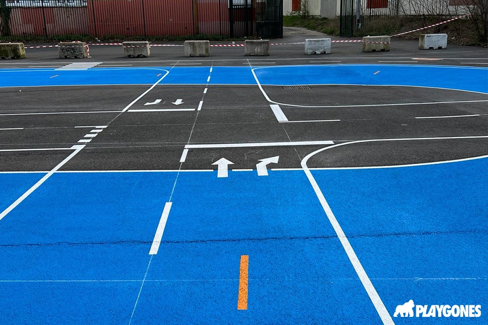 Personnalisable et adaptable à la superficie disponible et aux différents publics, l’aménagement des cours d’écoles peut se faire par un design actif (marquage au sol) et/ou de petits équipements sportifs.