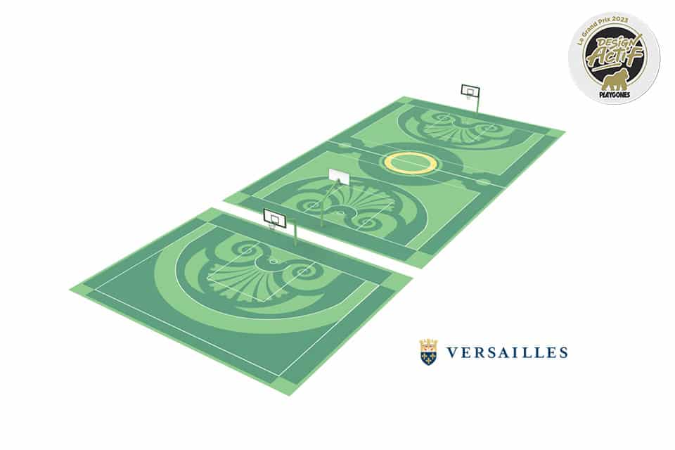 La Ville a souhaité mettre en place un design qui mêle le respect des contraintes liées à la pratique du basket (position des lignes, dimension des terrains, position des poteaux de basket) et l’esthétisme avec une référence aux jardins en privilégiant des nuances de verts. En effet, le revêtement est inspiré des lignes symétriques des jardins du château de Versailles créés par André Le Nôtre.