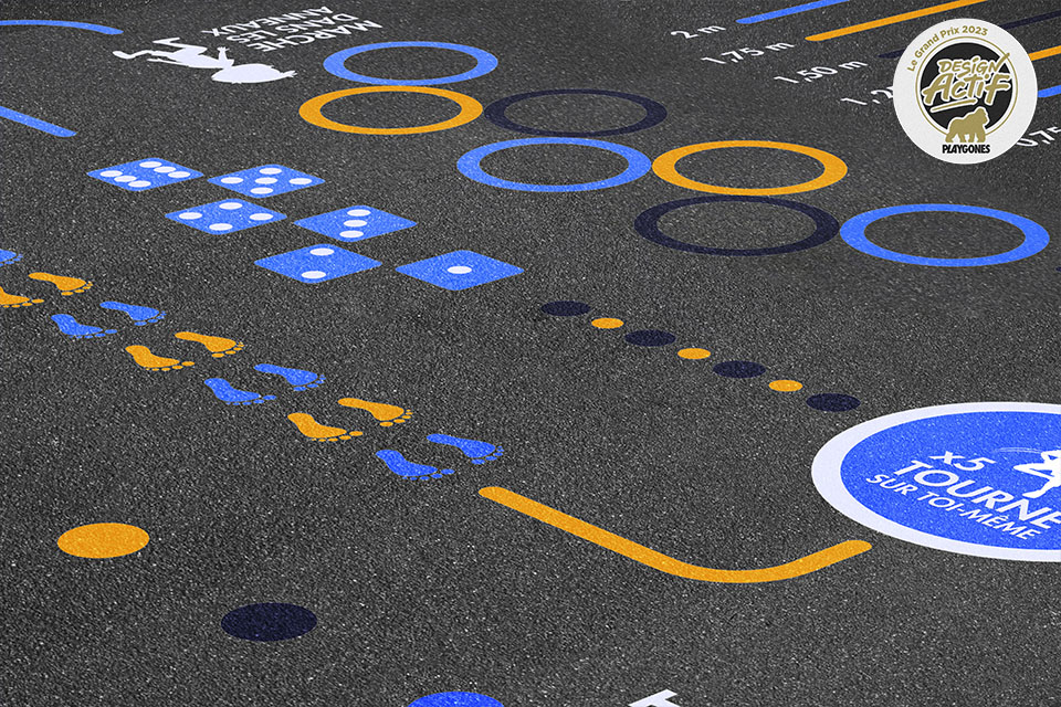 Le design actif consiste à faire de l’espace public un terrain de jeu pour inciter à bouger plus, grâce à des installations légères, ludiques et accessibles à tous gratuitement : agrès, chronomètre géant, radar de vitesse, marquages au sol, objets connectés, etc. »