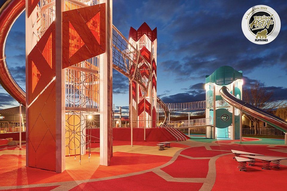 SKYPARK, adapté aux enfants jusqu’à 12 ans, favorise l’inclusivité grâce à des éléments sensoriels, des rampes et des équipements accessibles en fauteuil roulant, permettant à tous les enfants de jouer ensemble. Des aventures nocturnes sont possibles grâce aux toboggans et aux tours illuminées par le magnifique travail de ProtoPixel.