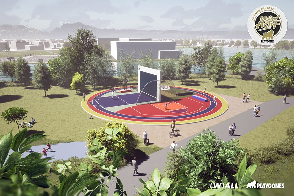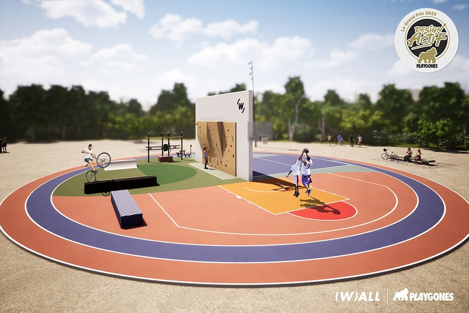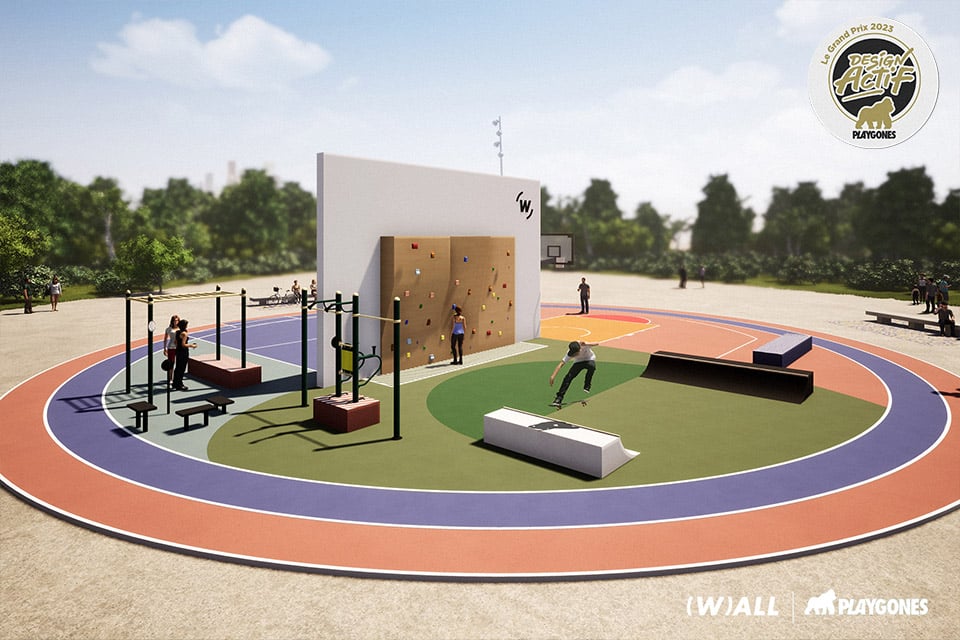 Le (W)ALL est le seul équipement sportif urbain qui s’articule autour d’un mur. Sa configuration en fait un véritable gymnase à ciel ouvert. Il favorise la coactivité, la convivialité et le partage, renforçant ainsi l’attractivité du sport et créant un nouveau lien social. Il mise sur l’innovation en intégrant une conception carbo-neutre et bio-climatique, visant à promouvoir une pratique sportive responsable.