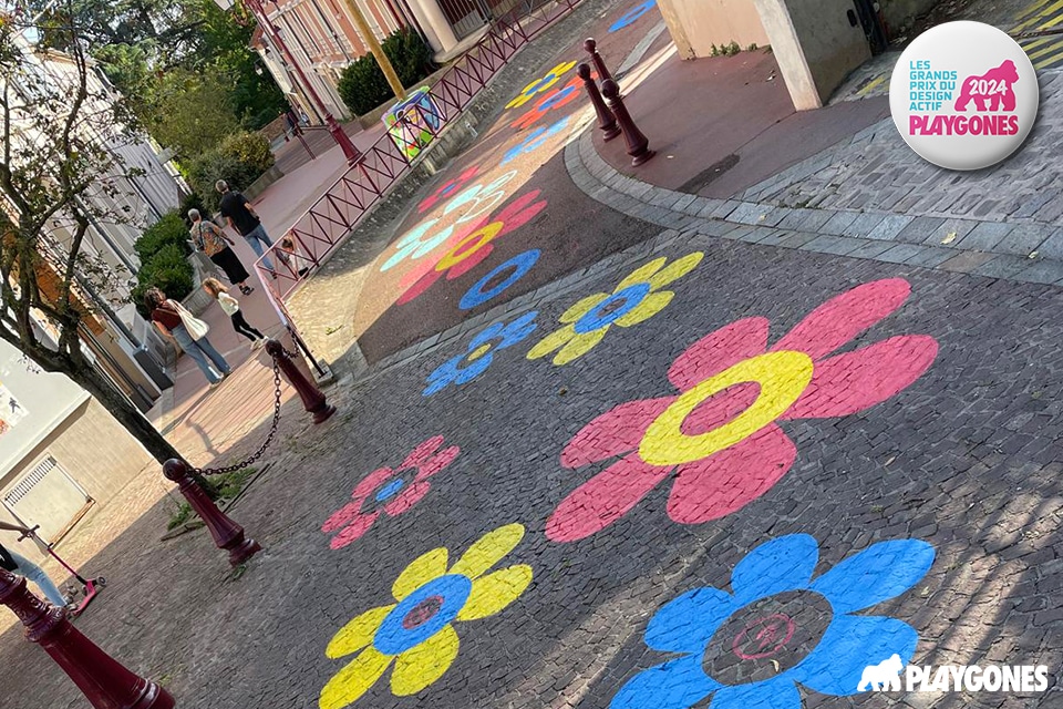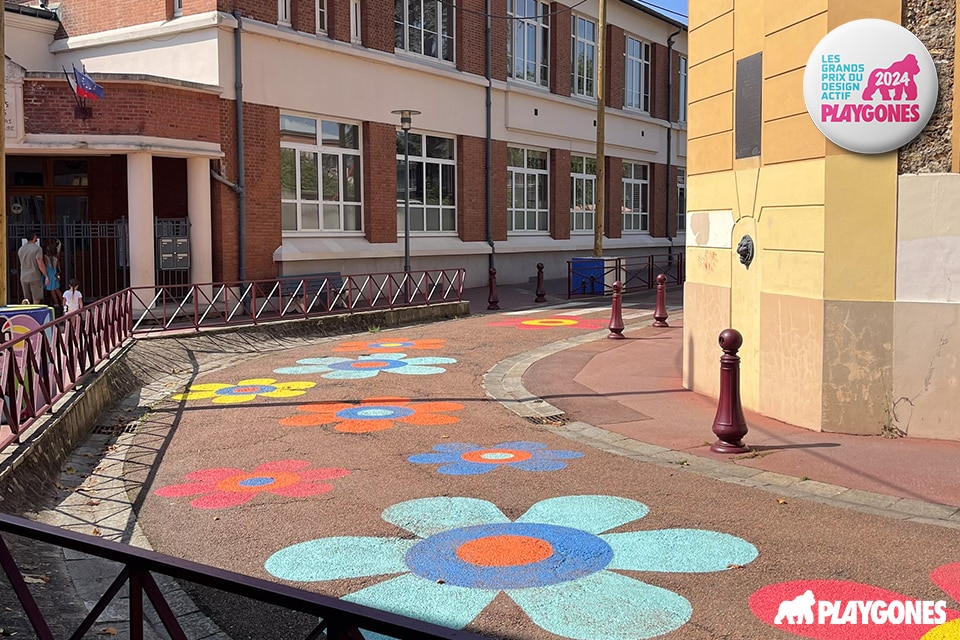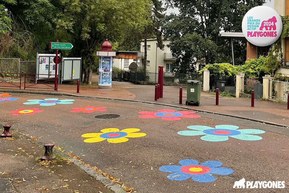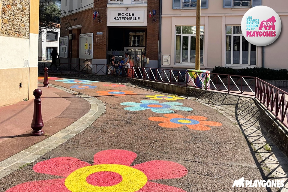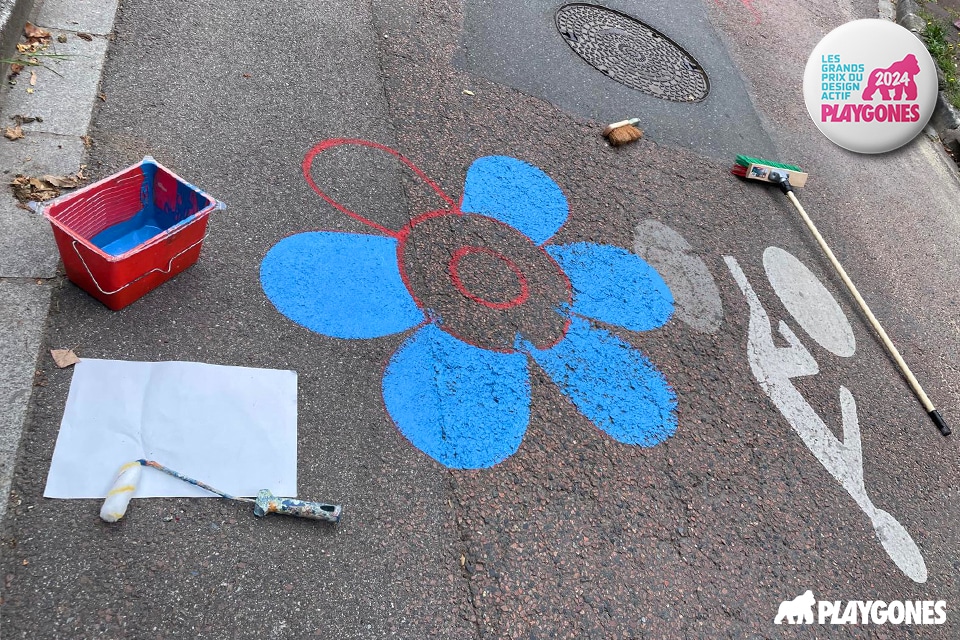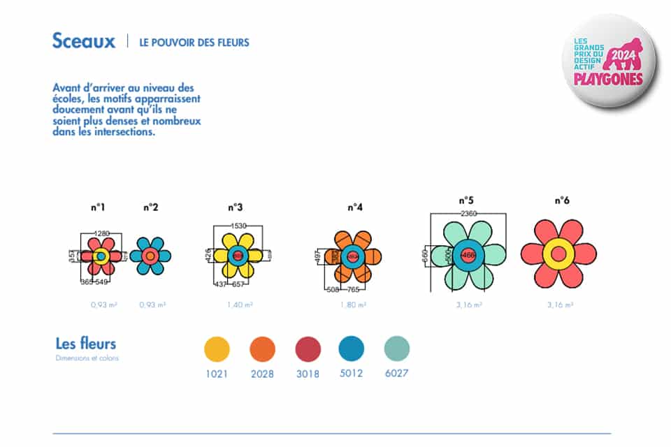 Dans ce sens nous avons proposé et réalisé des marquages au sol en forme de fleurs colorées. Des marquages ludiques, de plus en plus grands à l’approche des passages piétons, pour rappeler aux conducteurs de ralentir pour assurer la sécurité des enfants. hashtag#DesignActif