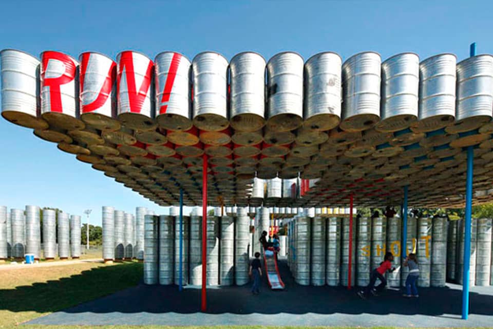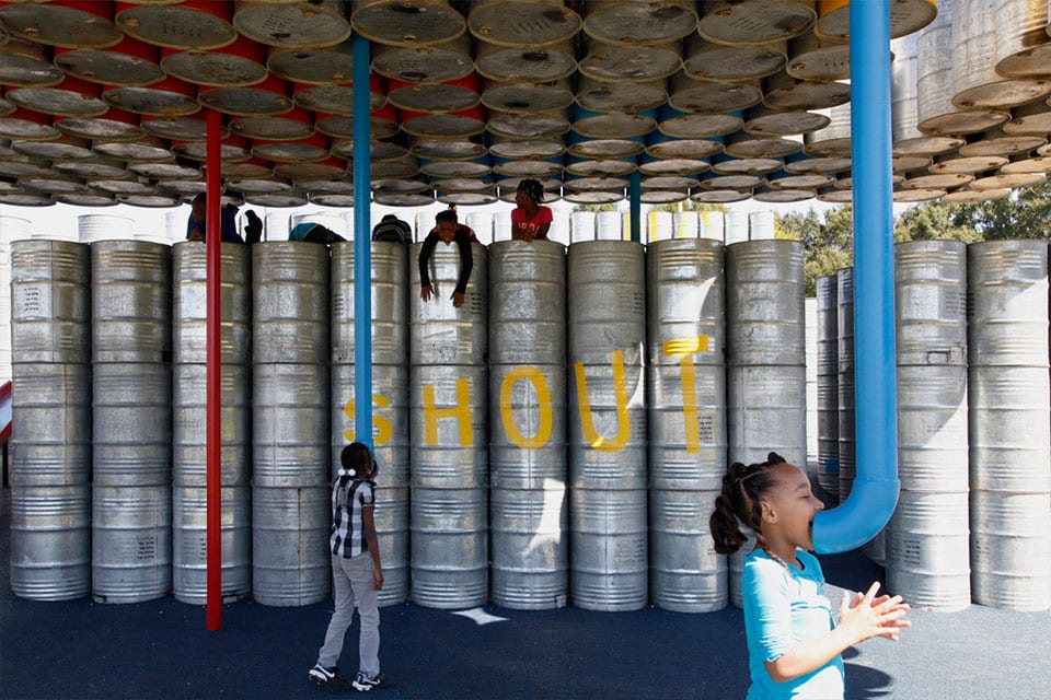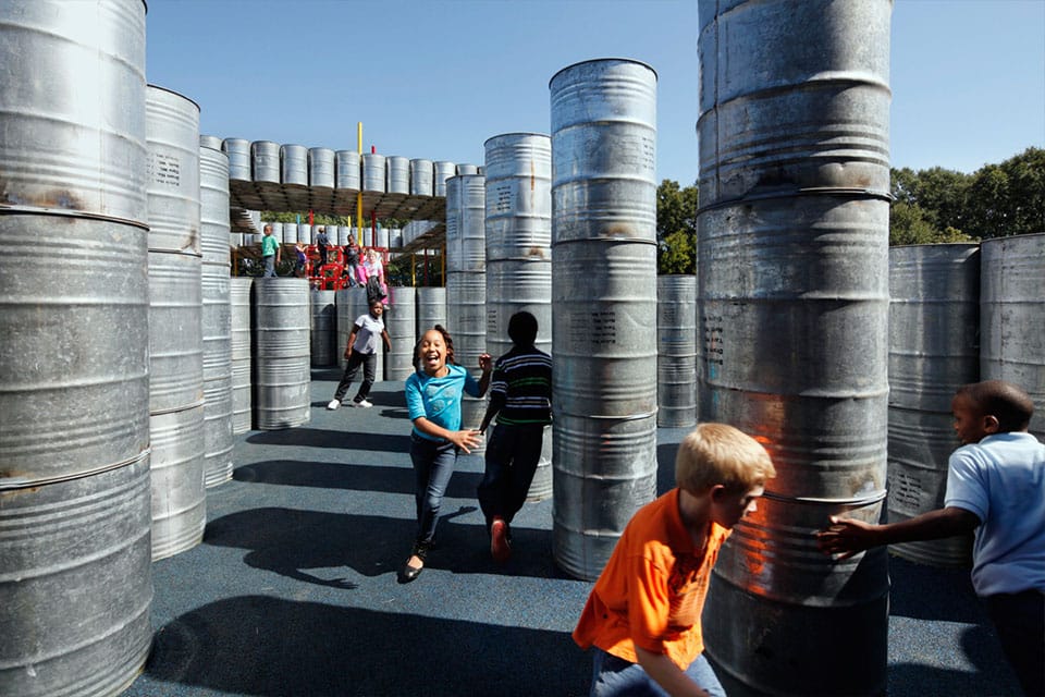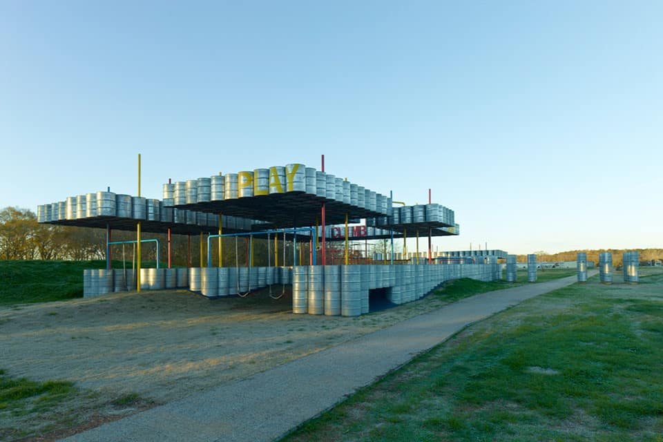 Un espace de jeu dédié aux enfants, constitué de 2 000 barils auparavant destinés pour transporter de l’huile de menthe. Rural Studio et Playscape ont créé un terrain de jeu atypique et unique. Une construction en forme de labyrinthe qui encourage l’effort et la créativité.