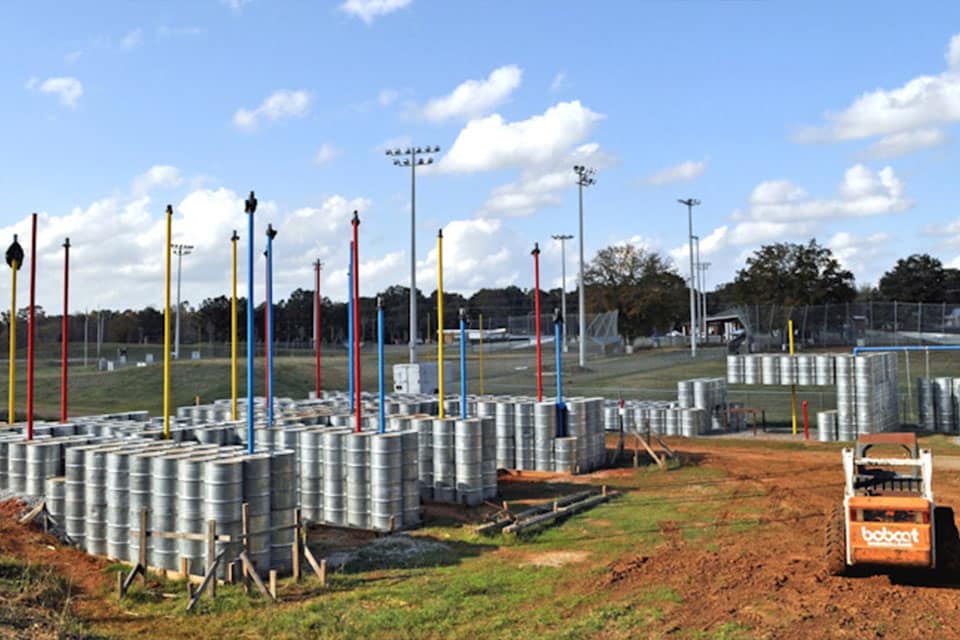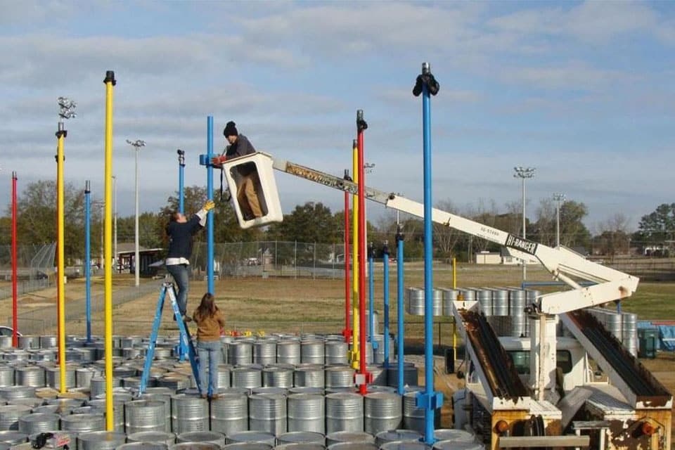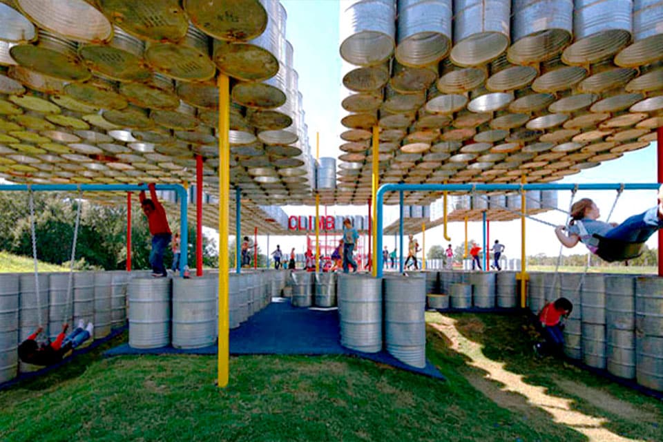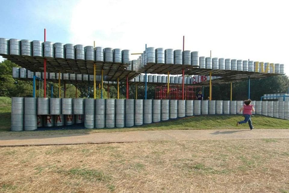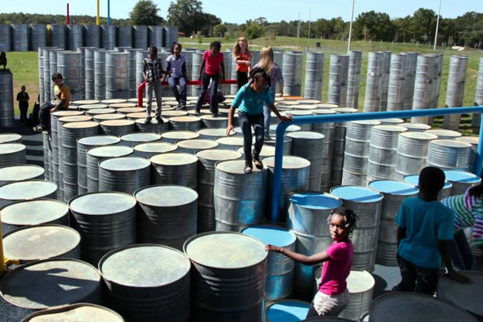 L’aire de jeux Lions Park en Alabama est incroyable. Elle est constituée de 2000 barils en acier galvanisé recyclés.