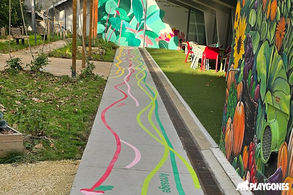 Résidence autonomie – Vaucluse : marquages ludiques pour baliser les zones actives extérieures.