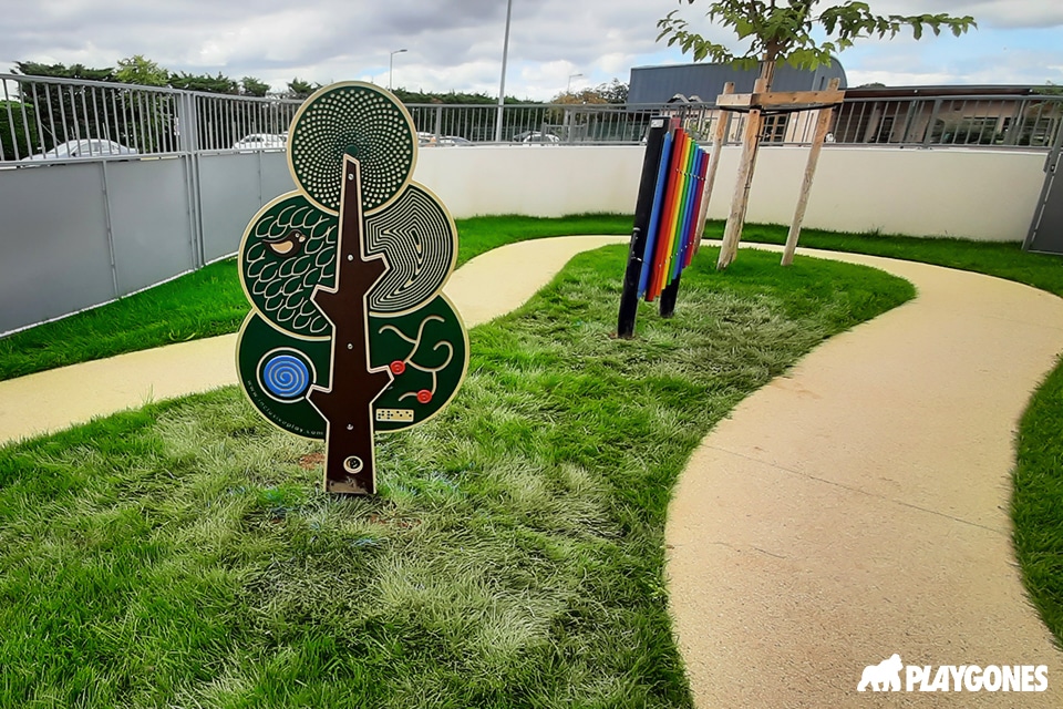 - Jeux sensoriels : panneaux musicaux, surfaces texturées, miroirs, couleurs contrastées