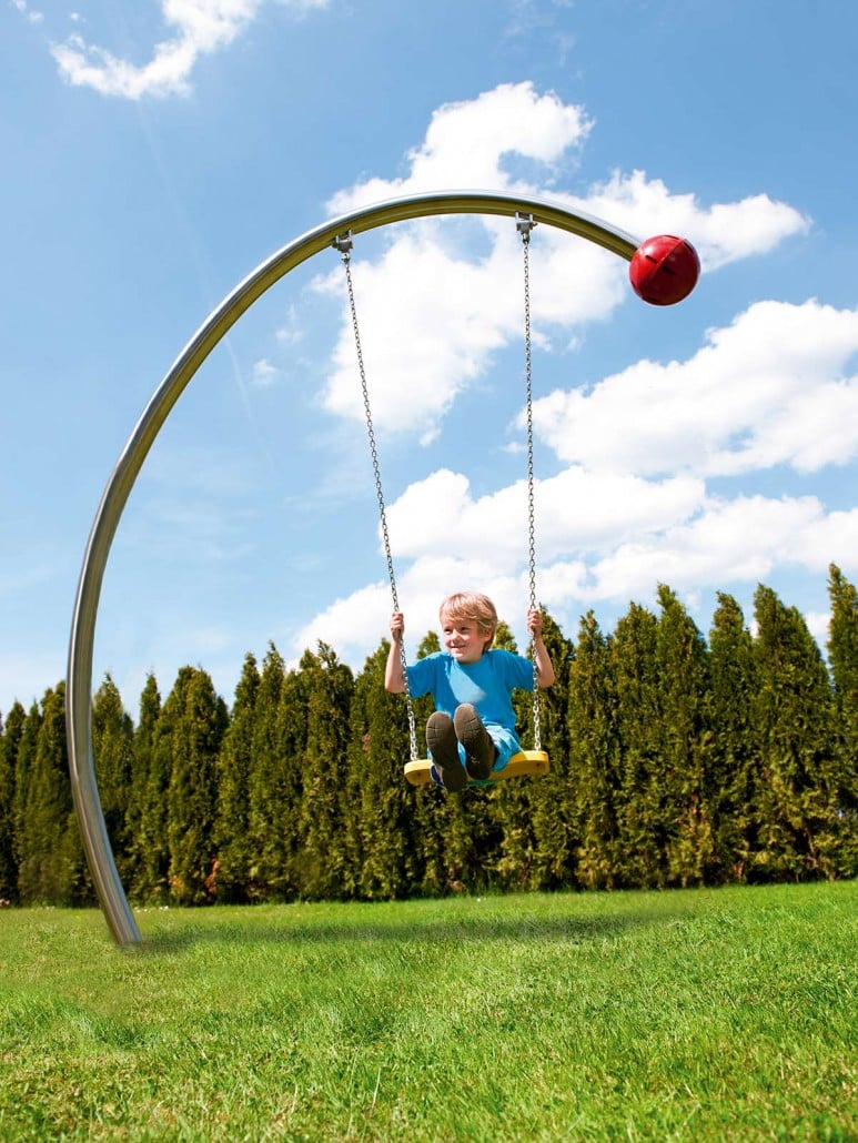 La balançoire libre – une nouvelle adaptation de Stilum qui attire tous les regards sur les aires de jeux. Le tube courbé en acier inoxydable de la balançoire sort tout naturellement du sol et il est complété par une boule en caoutchouc naturel. Le siège de la balançoire est fixé à la courbe, de sorte que les enfants ont l’impression de flotter.