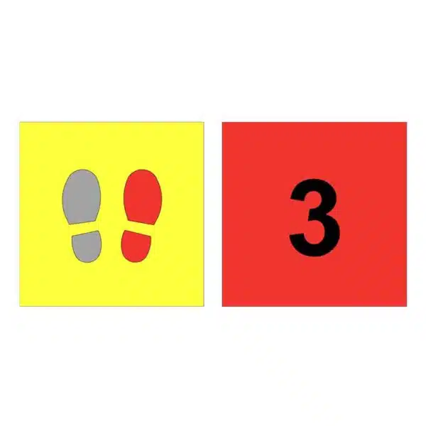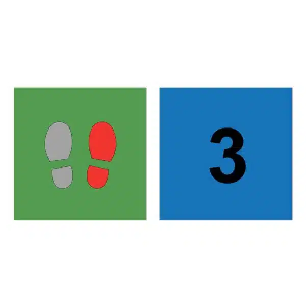 Des empreintes de pieds encadrées de carrés pour jouer avec les postures et l’équilibre.