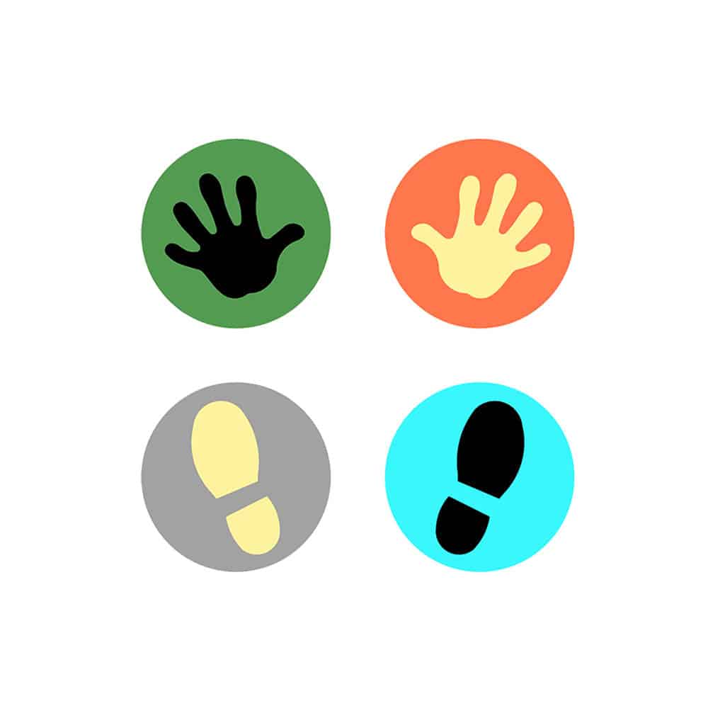 Des mains et des pieds colorés en cercle pour coordonner gestes et déplacements.