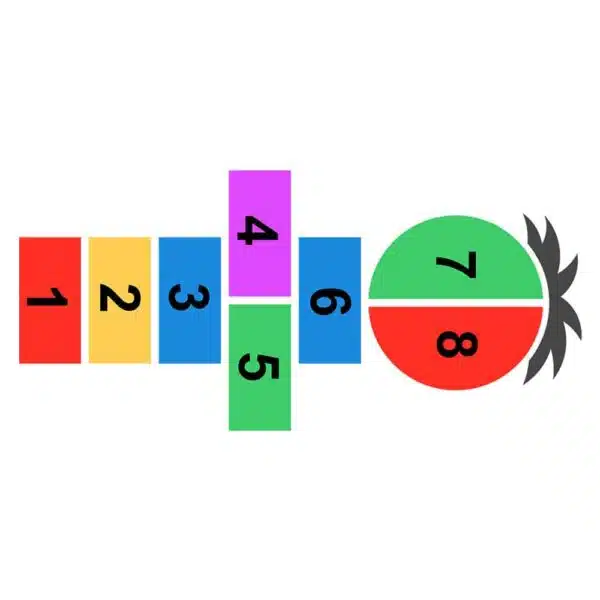 Variante dynamique de la marelle garçon, avec couleurs vives pour favoriser la visibilité au sol.