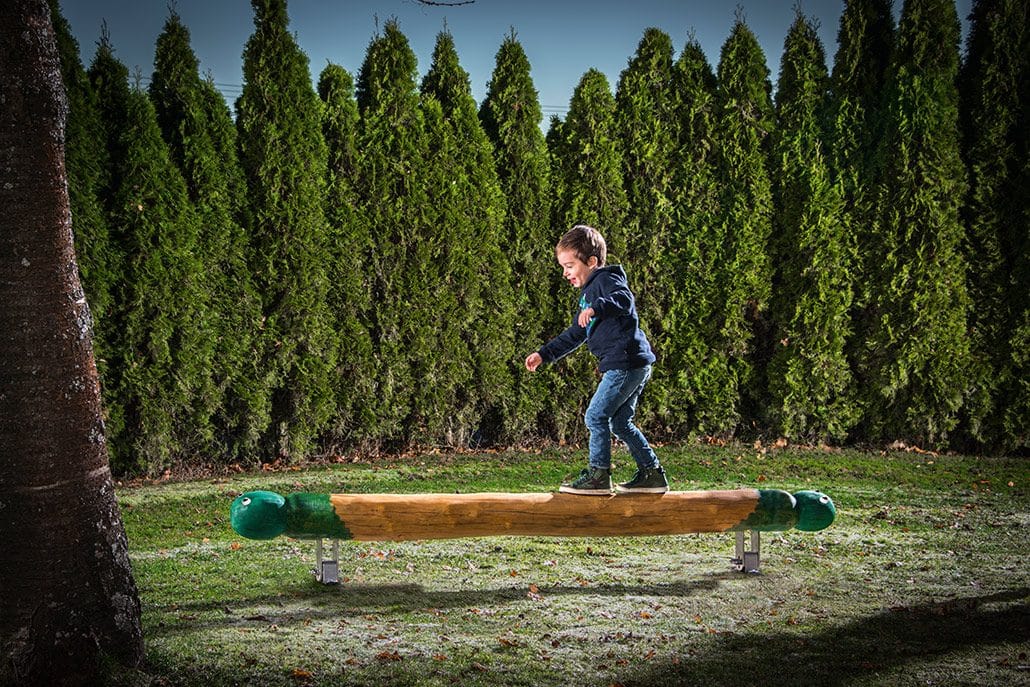 Entièrement en bois de robinier, L’élément d’équilibre en forme de serpent, ondule à travers la prairie.