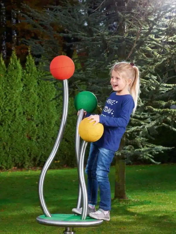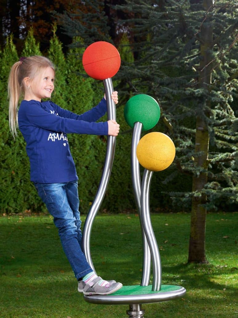 Le nouveau « flova tria » de stilum est un point de jeu particulièrement impressionnant. Trois boules colorées flottant sur des barres en acier inoxydable. Et le meilleur : l’appareil peut être installé sans protection antichute. Parfait pour les zones piétonnes ! Il se bascule quand les enfants jouent dessus.