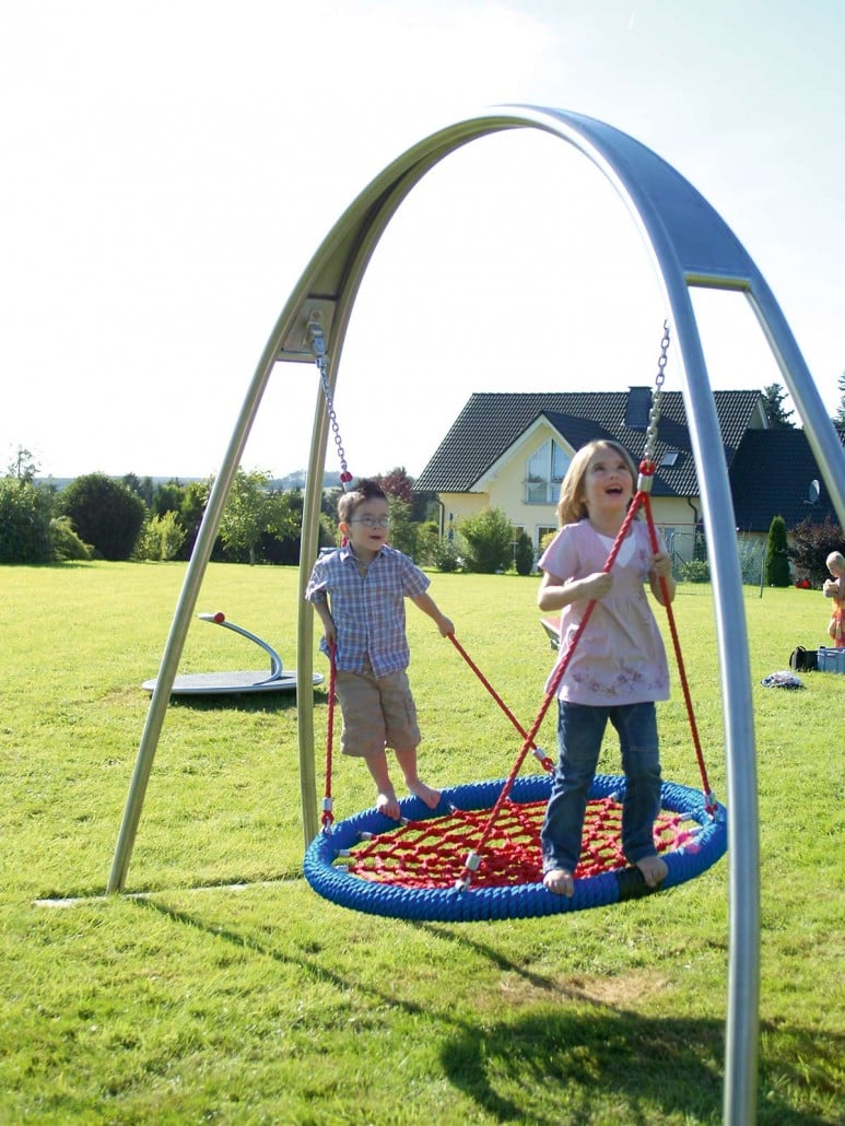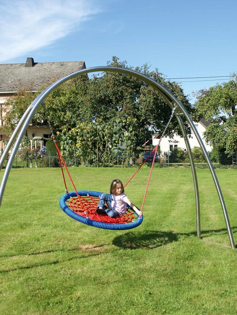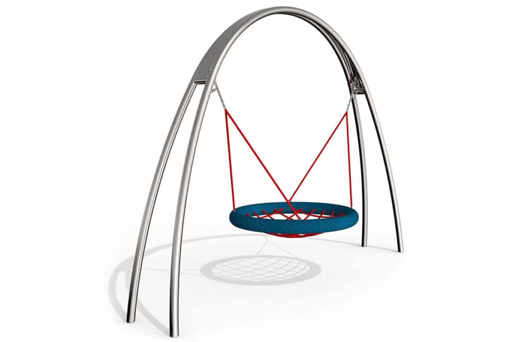 Le nid d’oiseaux Volucris, plaisir et sensations garantis. Deux élégantes arches en acier inoxydable portent le panier en corde, une structure très stable.