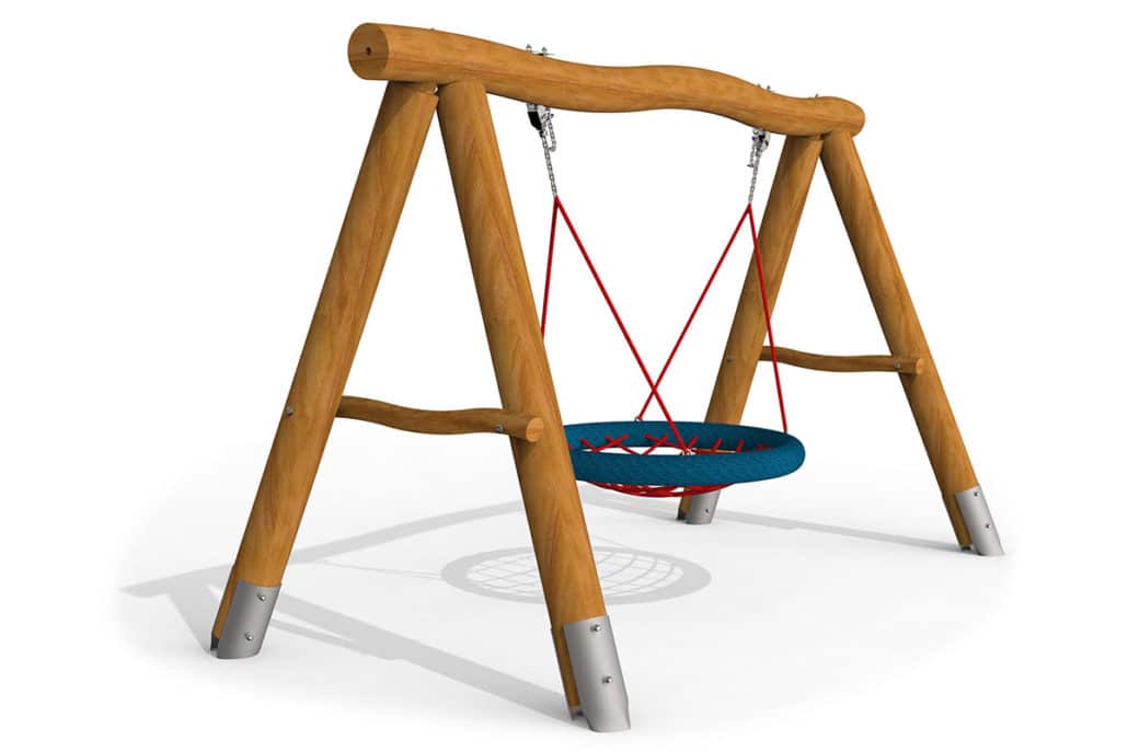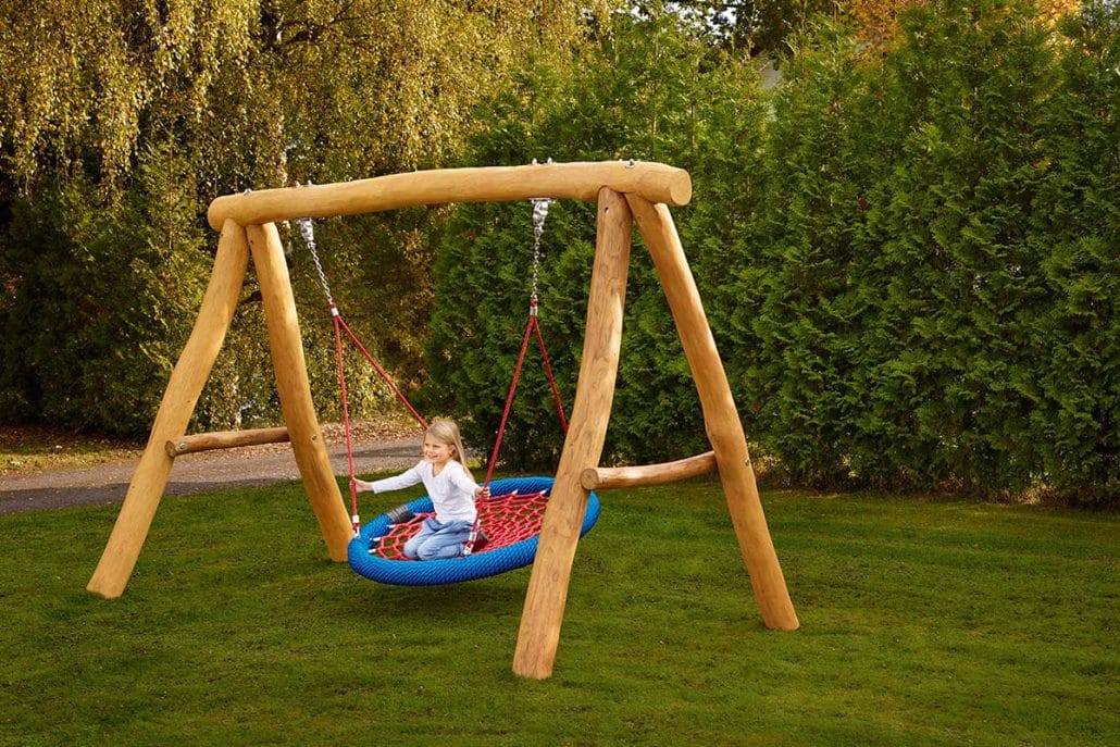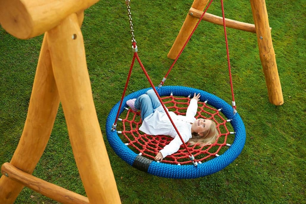 Une balançoire en nid d’oiseaux – Des poteaux massifs en robinier portent un panier stable en cordage dans lequel même les petits enfants peuvent faire leurs premières expériences de sensation dans une aire de jeux.