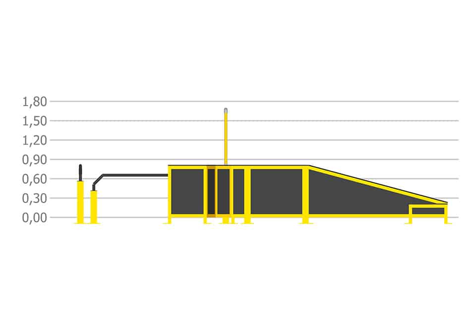 Une aire d’entraînement au parkour avec une configuration simple avec plusieurs plateformes reliées par un mur intermédiaire et une barre de traction.