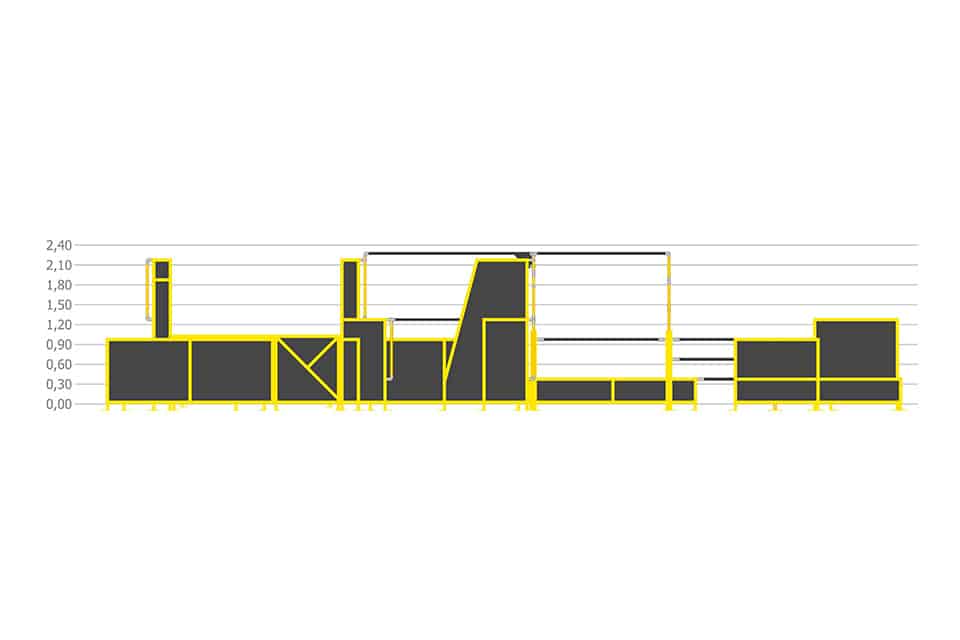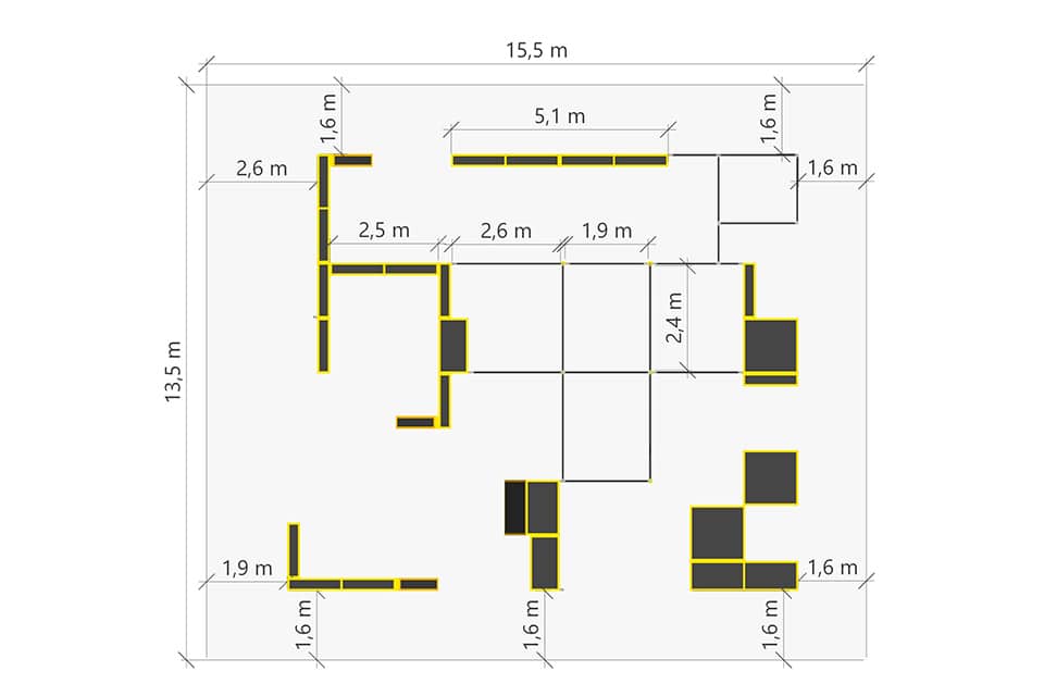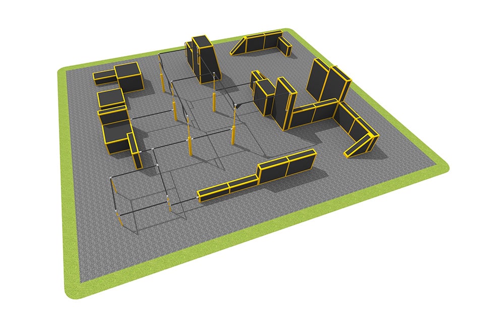 Occupant une superficie de 202,5 m², ce modèle est destiné à être utilisé dans de grands espaces publics ou comme point d’entraînement central pour les pratiquants avancés de parkour.