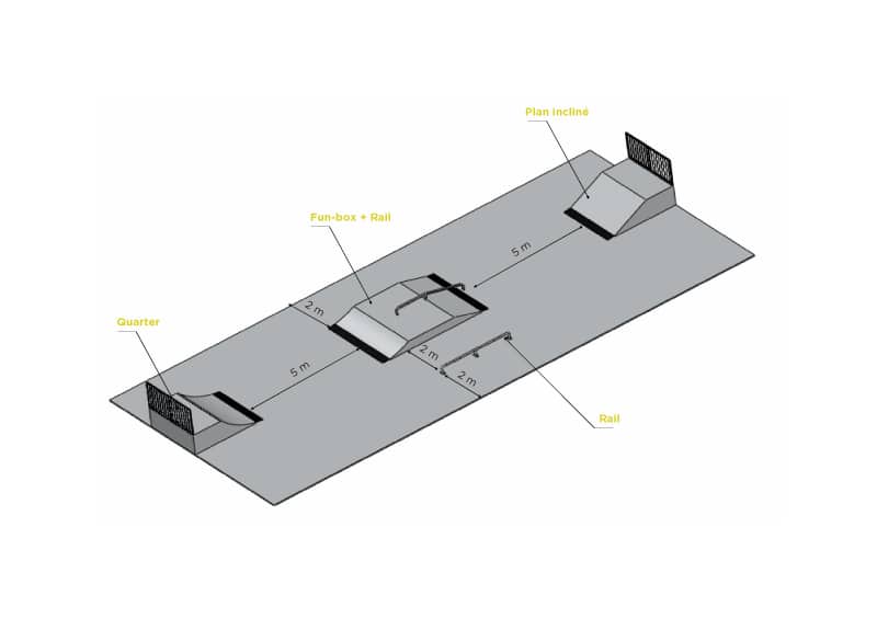 Skatepark débutant 2 est un skatepark clé en main conçu pour l’apprentissage du skate, roller et trottinette. Sa configuration simple et évolutive permet aux jeunes pratiquants de progresser en sécurité. Structure en Acier galvanisé, inox, aluminium, conforme à Norme NF EN 14974 – 14974/IN97.