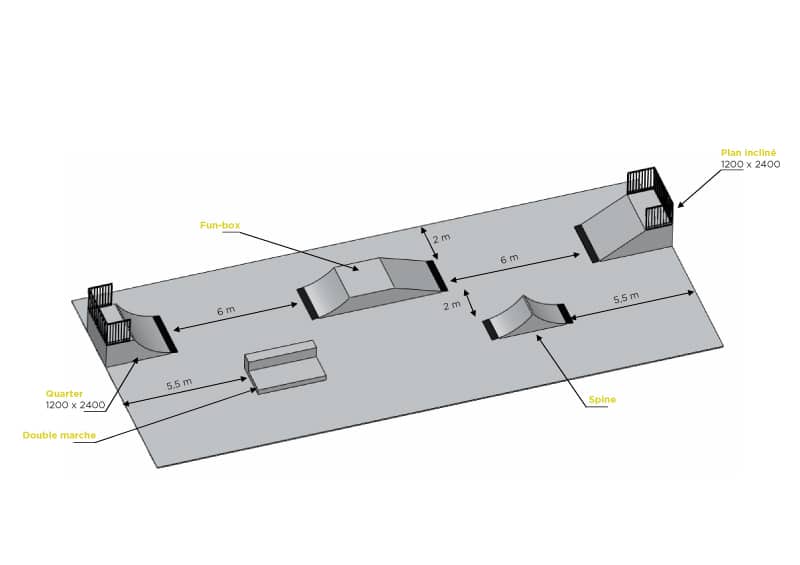 Skatepark 1 est un skatepark modulaire associant différentes typologies de modules. Il s’intègre facilement dans tout aménagement urbain dédié à la glisse. Fabriqué en Acier galvanisé, inox, aluminium, conforme à Norme NF EN 14974 – 14974/IN89.