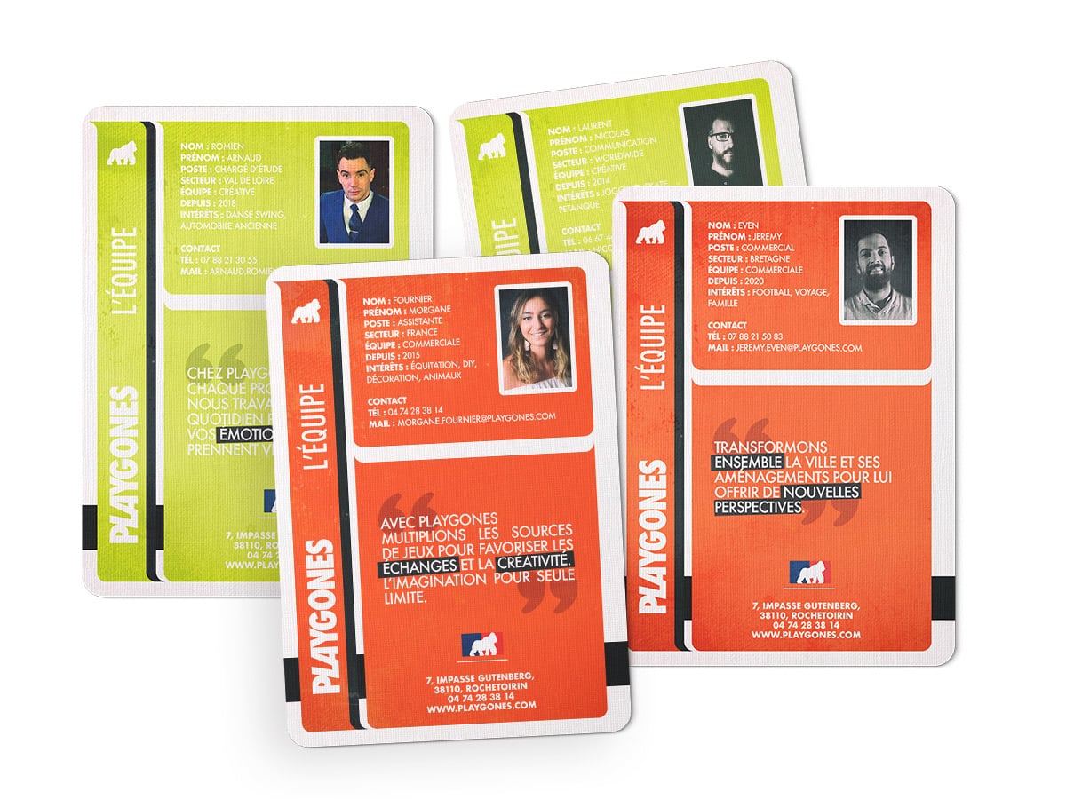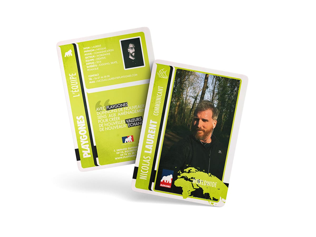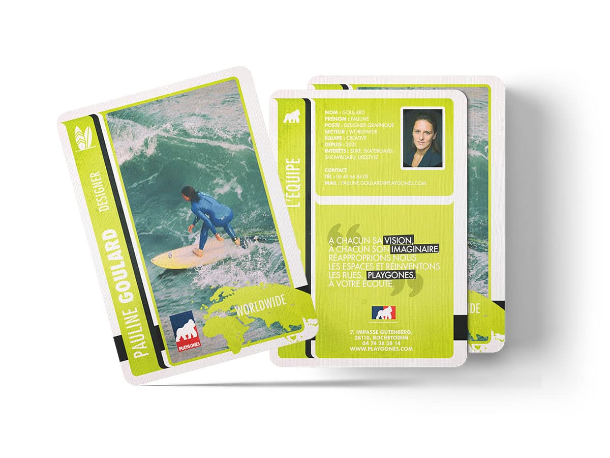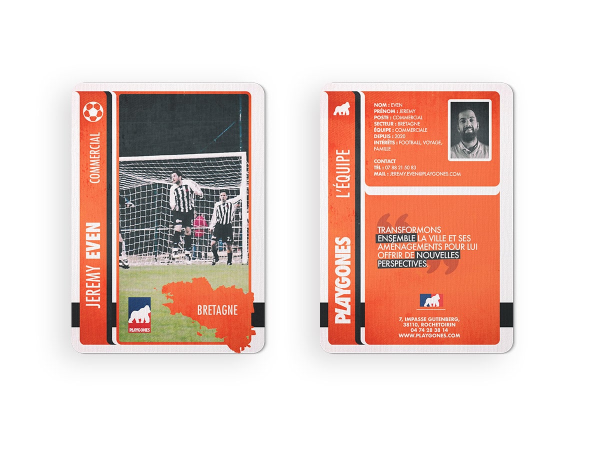 Pour l’occasion, nous avons créé des nouvelles cartes de visite, plutôt atypiques, pour mettre en avant les centre d’interêts sportifs et/ou ludiques de chaque membre de Playgones.