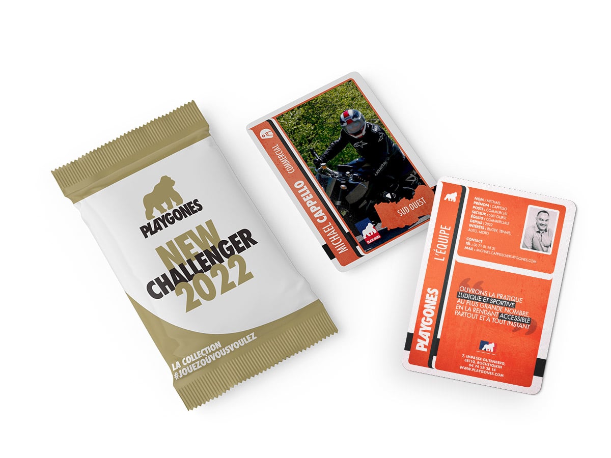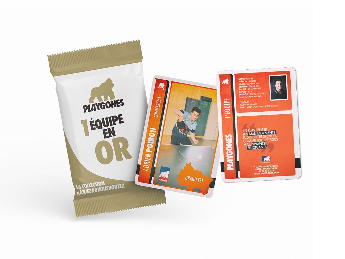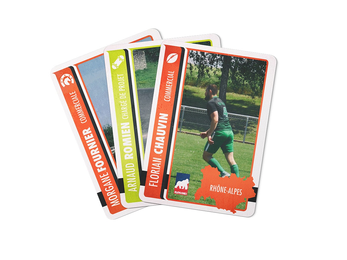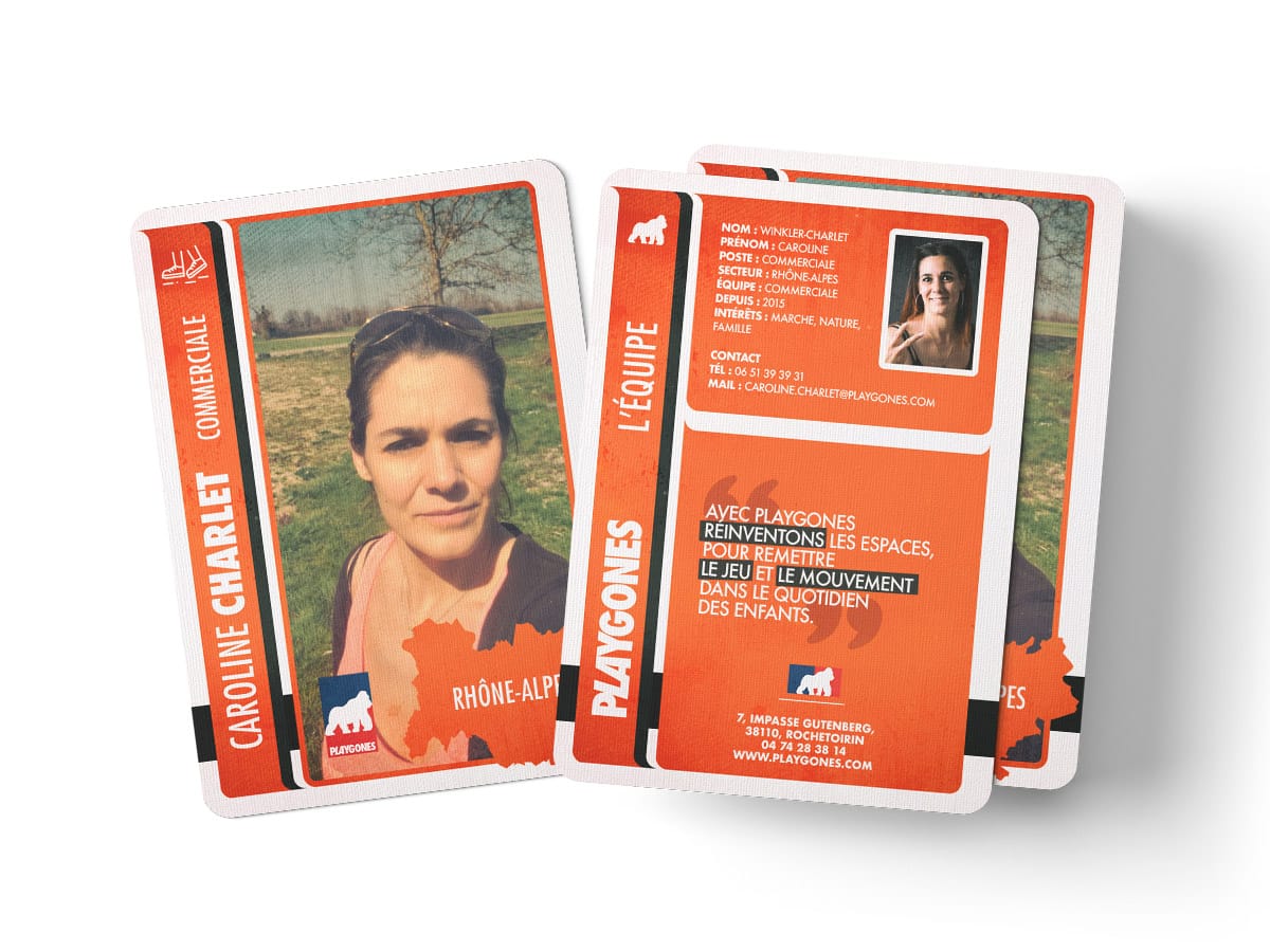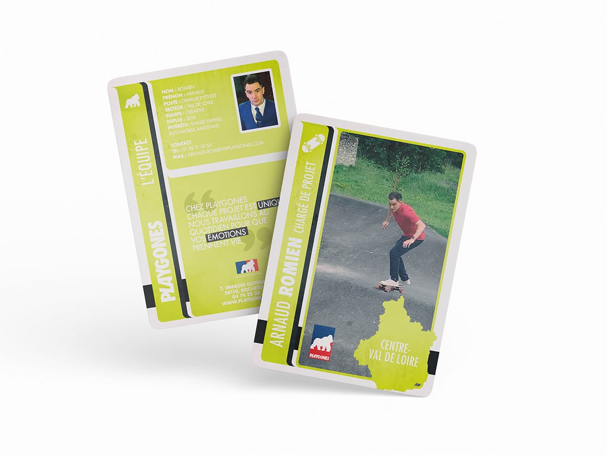 Pour l’occasion, nous avons créé des nouvelles cartes de visite, plutôt atypiques, pour mettre en avant les centre d’interêts sportifs et/ou ludiques de chaque membre de Playgones.