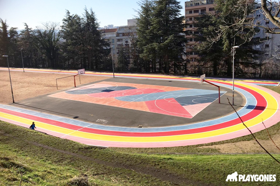 En 2023, suite au succès, et à la jeunesse retrouvée de l’espace, nous avons proposé et réalisé la mise en couleur des 4 pistes entourant le plateau sportif.