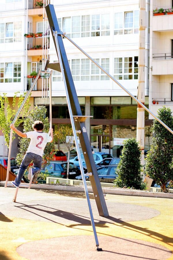 Rope Bridge a une hauteur de chute libre supérieure à 600 mm. Afin de se conformer à la norme EN 1176, veuillez prévoir un espace libre de 1,5 m autour du pont de corde afin qu'il n'y ait pas d'objets durs dans l'espace de chute. |