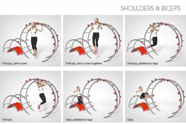 Cet appareil multifonctions en acier inoxydable de Stilum offre de nombreuses possibilités d’exercices de poussée et de traction favorables au renforcement symétrique des principaux groupes musculaires du haut du corps.