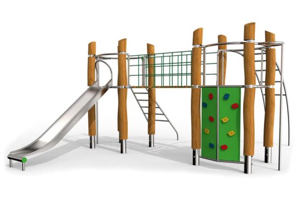 Très impressionnant et de grand volume, le grand parc de jeux Ascendo 2 robinier impressionne sur tous les terrains de jeux et offre aux enfants à partir de 6 ans beaucoup de plaisir. La tour avec le toboggan, et l’échelle d’escalade est reliée avec un pont suspendu sur la deuxième tour qui comprend les 2 barres glissantes, le mur d’escalade et l’escalier d’escalade en forme de demi-cercle.