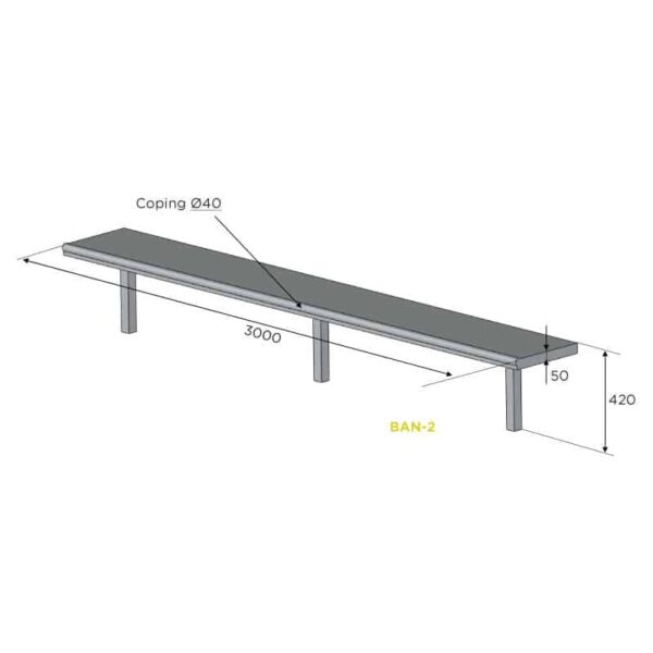Banc 2 – Banc technique pour figures de précision. Pensé pour les riders exigeants, le Banc 2 offre une zone d’approche optimisée pour les tricks de type slide ou boardslide. Sa composition en acier galvanisé, inox et aluminium le rend ultra résistant aux conditions extrêmes et aux impacts répétés. Ce module s’intègre parfaitement à tout parcours de skatepark modulaire certifié NF EN 14974 / IN2.