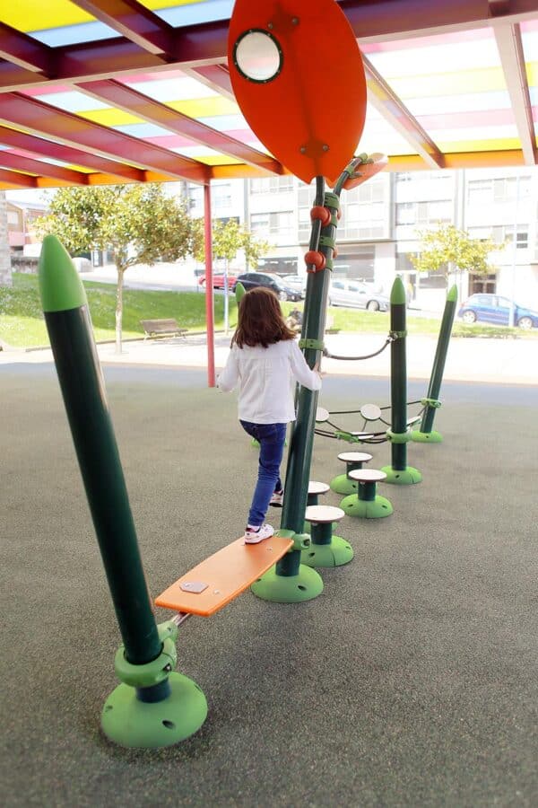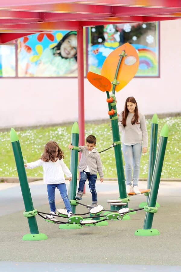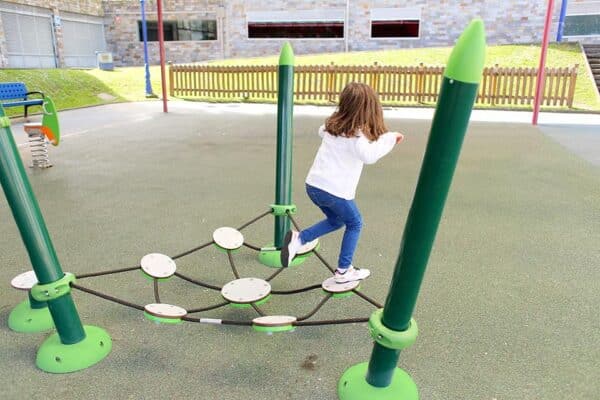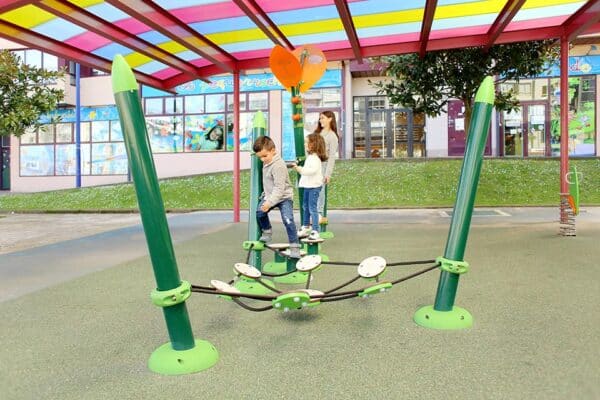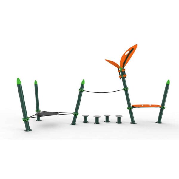 Rope Tunnel, Climb Ladder and Tarzan Ring Beam ont une hauteur de chute libre supérieure à 600 mm. Afin d'être conforme à la norme EN 1176, veuillez espacer correctement ces éléments afin qu'il n'y ait pas d'objets durs dans l'espace de chute. |