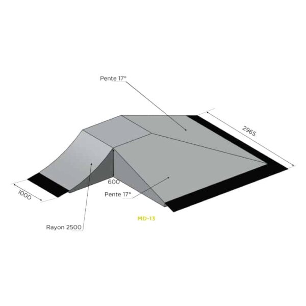 Le Module débutant 13 est un module conçu pour les skateparks modulaires. Spécialement conçu pour les novices en sports de glisse, il permet une initiation progressive au skate, roller et trottinette. Sa conception sécurisée et sa conformité à Norme NF EN 14974 – 14974/IN51 en font un choix idéal pour les jeunes riders.