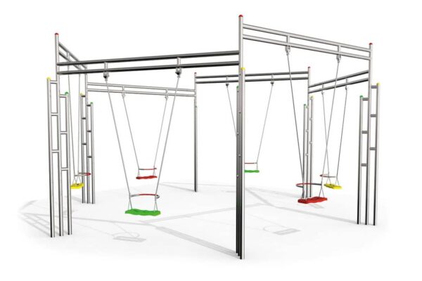 Le module a une forme spécifique, il a été crée en forme hexagonale pour garantir une meilleur communication entre les enfants. Il stimule les rencontres et les enfants peuvent organiser des petits concours entre eux comme essayer d’être synchronisé lors du balancement. Les sièges sont en caoutchouc et sont disponibles en différentes couleurs.