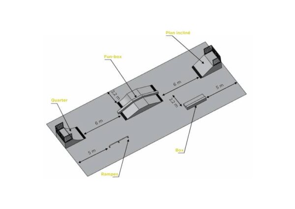 Skatepark 5 propose une alternance dynamique entre modules de sauts et surfaces de glisse. Conçu pour stimuler la créativité des pratiquants, il est adapté à une fréquentation régulière. Matériaux durables : Acier galvanisé, inox, aluminium. Conforme à Norme NF EN 14974 – 14974/IN91.