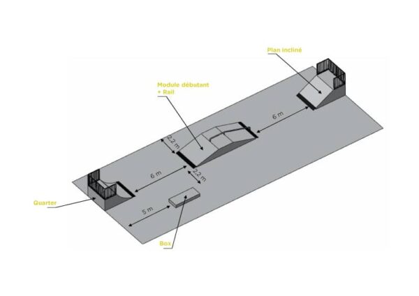 Skatepark 6 combine rails, courbes et modules bas pour un terrain de jeu polyvalent. Accessible à tous les niveaux, il favorise la pratique freestyle dans un cadre sécurisé. Fabriqué en Acier galvanisé, inox, aluminium, conforme à Norme NF EN 14974 – 14974/IN92.