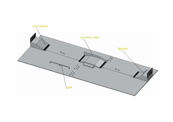 Skatepark initié est un skatepark modulaire associant différentes typologies de modules. Il s’intègre facilement dans tout aménagement urbain dédié à la glisse. Fabriqué en Acier galvanisé, inox, aluminium, conforme à Norme NF EN 14974 – 14974/IN98.