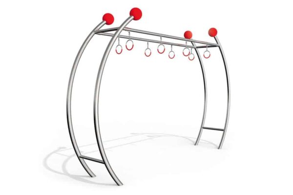 Cet élément permet d’intégrer des activités sportives à l’extérieur et d’embellir les espaces urbains avec un look moderne et de haute qualité en acier inoxydable et des anneaux de suspension rouges. Cet équipement de sport de plein air est conçu pour les adolescents à partir de 10 ans.