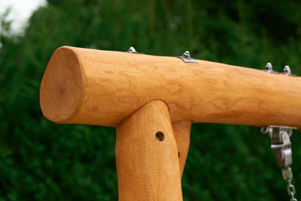 Une balançoire en nid d’oiseaux – Des poteaux massifs en robinier portent un panier stable en cordage dans lequel même les petits enfants peuvent faire leurs premières expériences de sensation dans une aire de jeux.