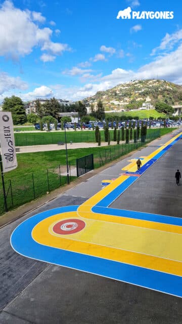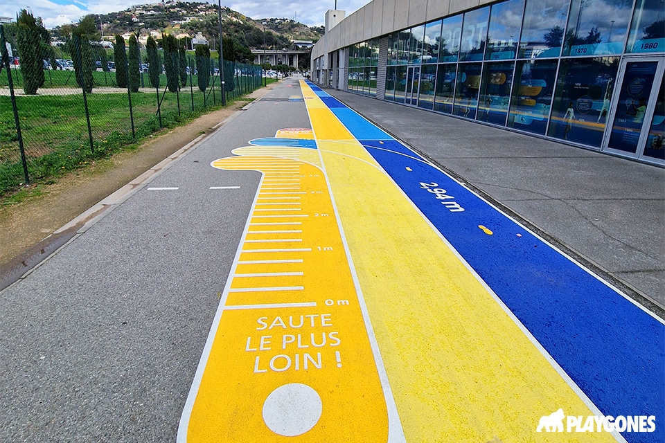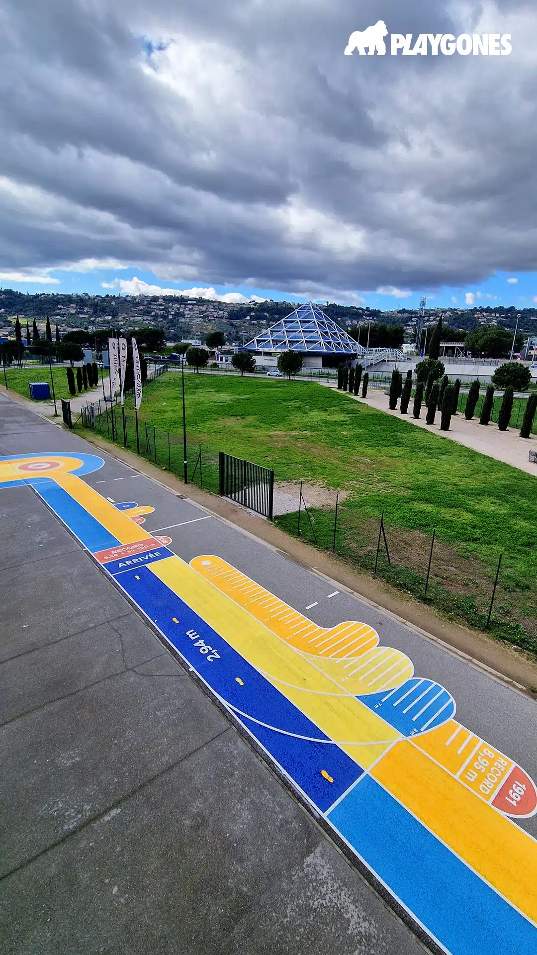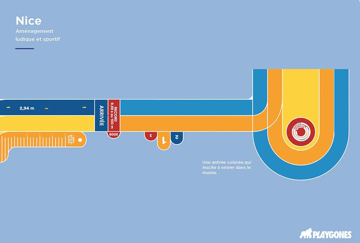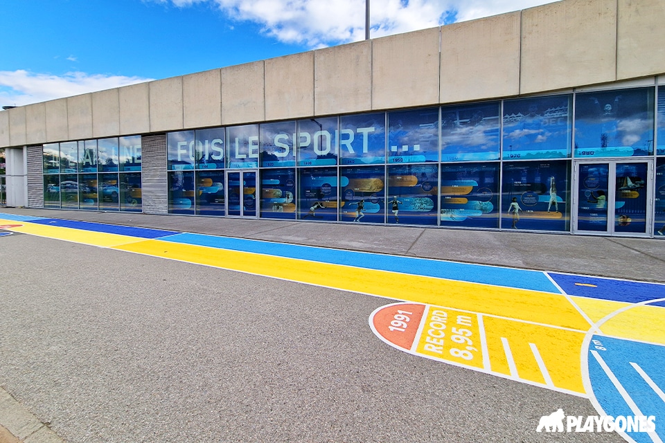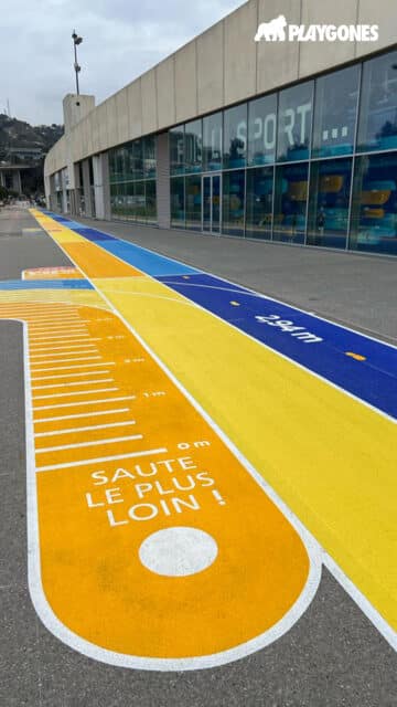 Lorsque la créativité graphique rencontre le sport, une fusion magique se produit. Devant le Musée National du Sport de Nice, cette fusion prend vie sous la forme d’un design actif vibrant et coloré. Sur une centaine de mètres, des éléments de design actif ont été peints, invitant les visiteurs à s’engager physiquement et mentalement dès leur arrivée. De la piste d’athlétisme jaune et bleue au marquage du record de 100 mètres détenu par Usain Bolt, chaque détail encourage l’activité physique et l’exploration.