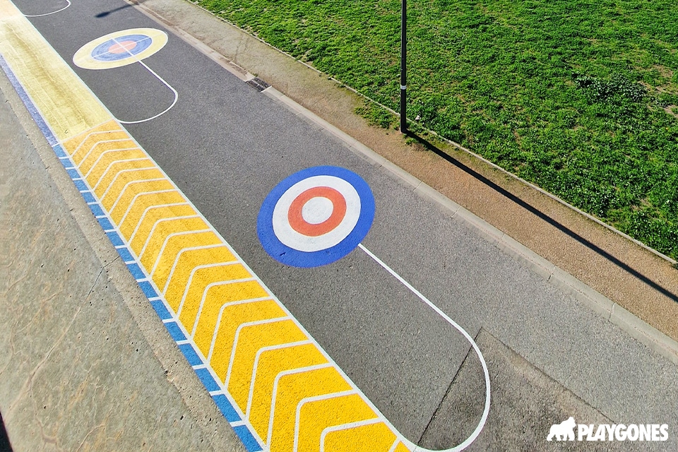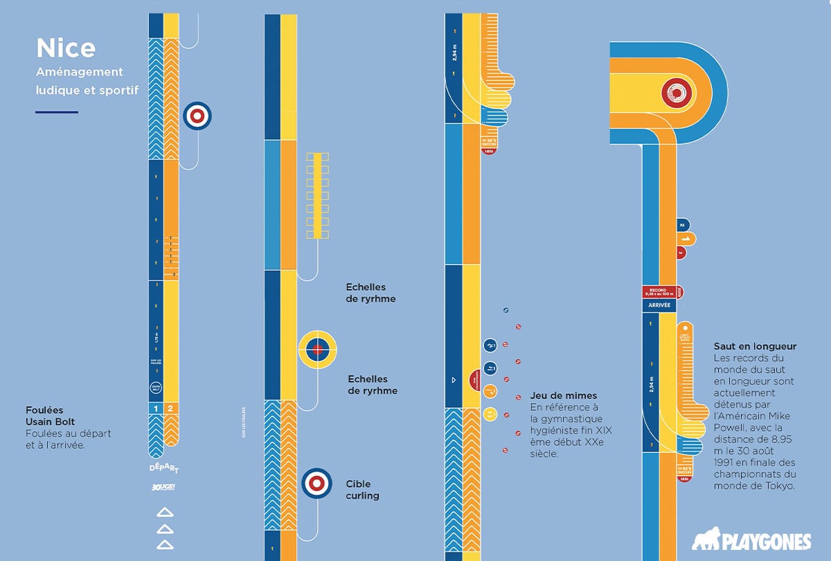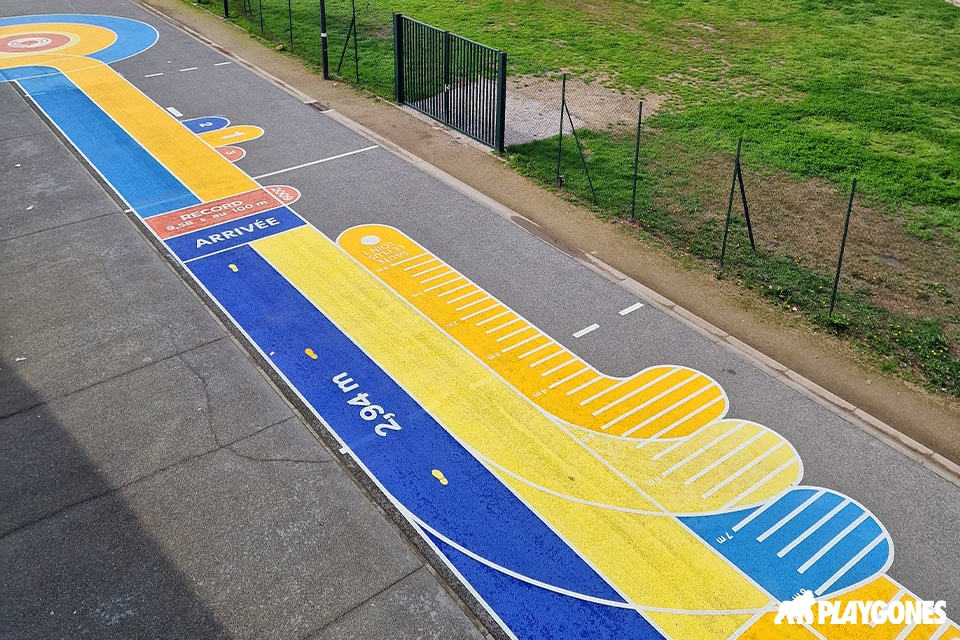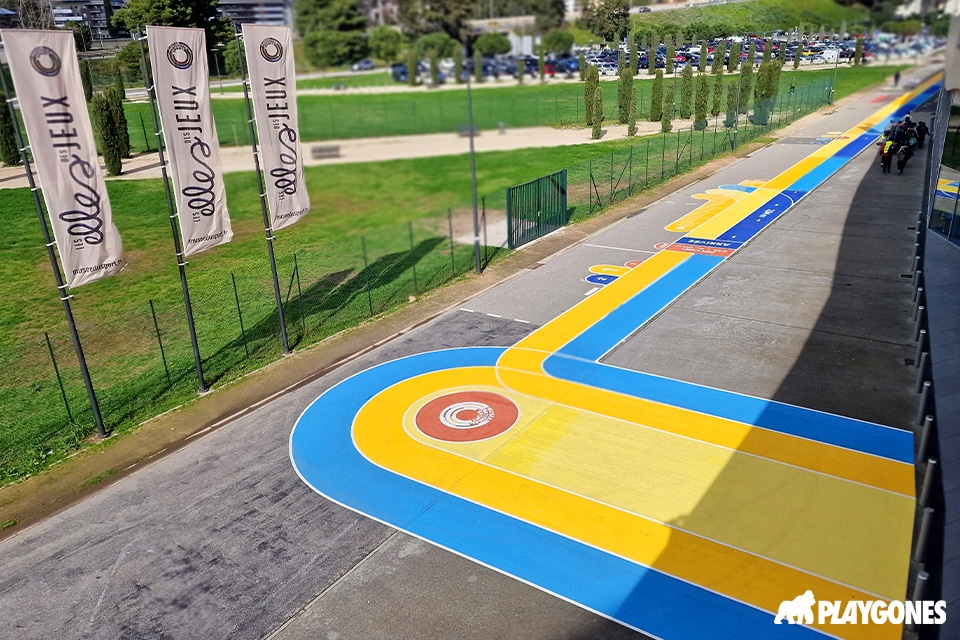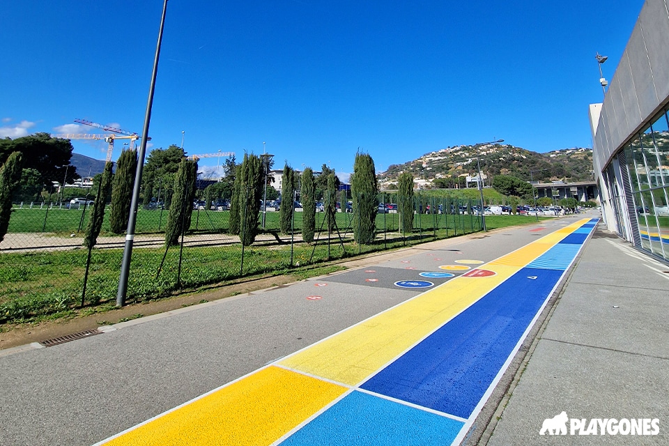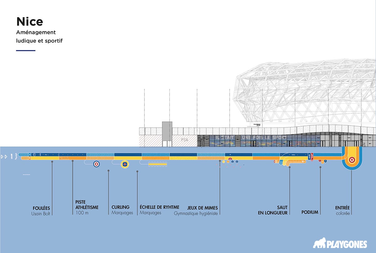 Lorsque la créativité graphique rencontre le sport, une fusion magique se produit. Devant le Musée National du Sport de Nice, cette fusion prend vie sous la forme d’un design actif vibrant et coloré. Sur une centaine de mètres, des éléments de design actif ont été peints, invitant les visiteurs à s’engager physiquement et mentalement dès leur arrivée. De la piste d’athlétisme jaune et bleue au marquage du record de 100 mètres détenu par Usain Bolt, chaque détail encourage l’activité physique et l’exploration.