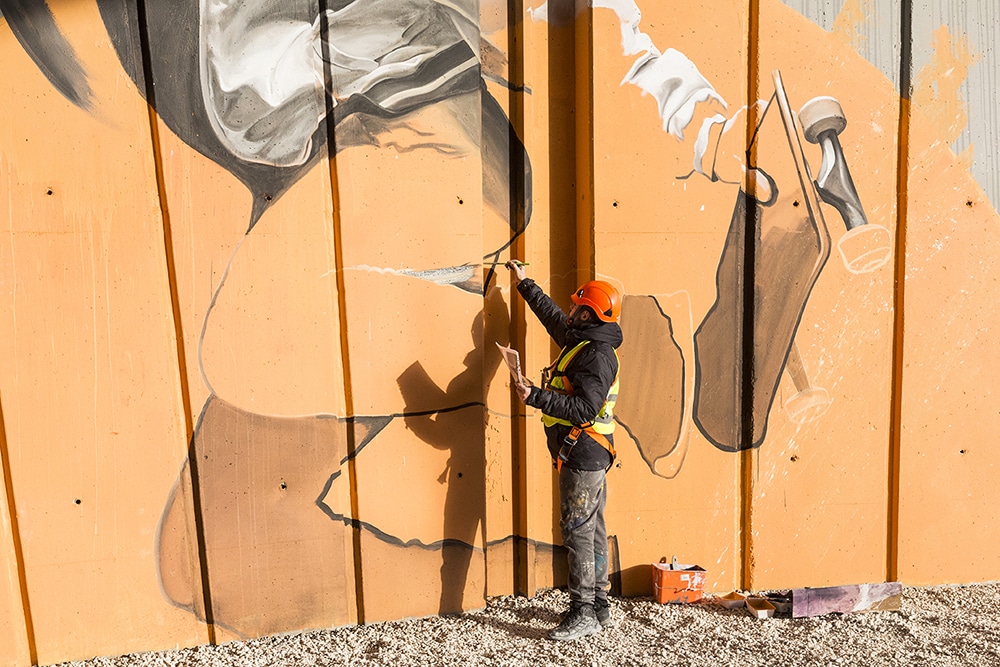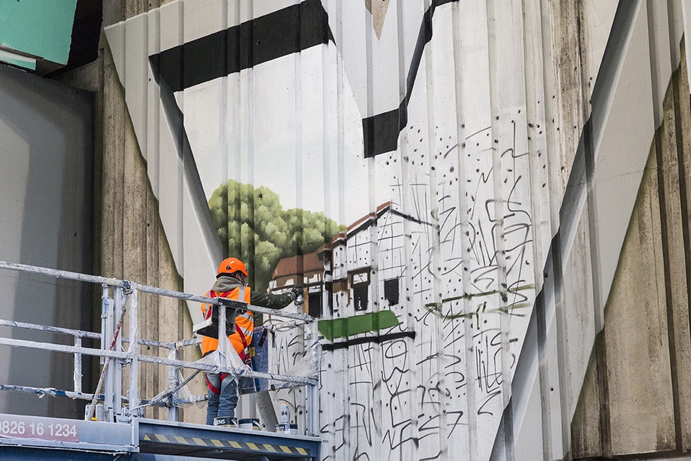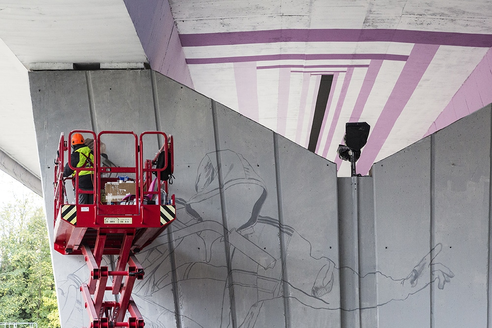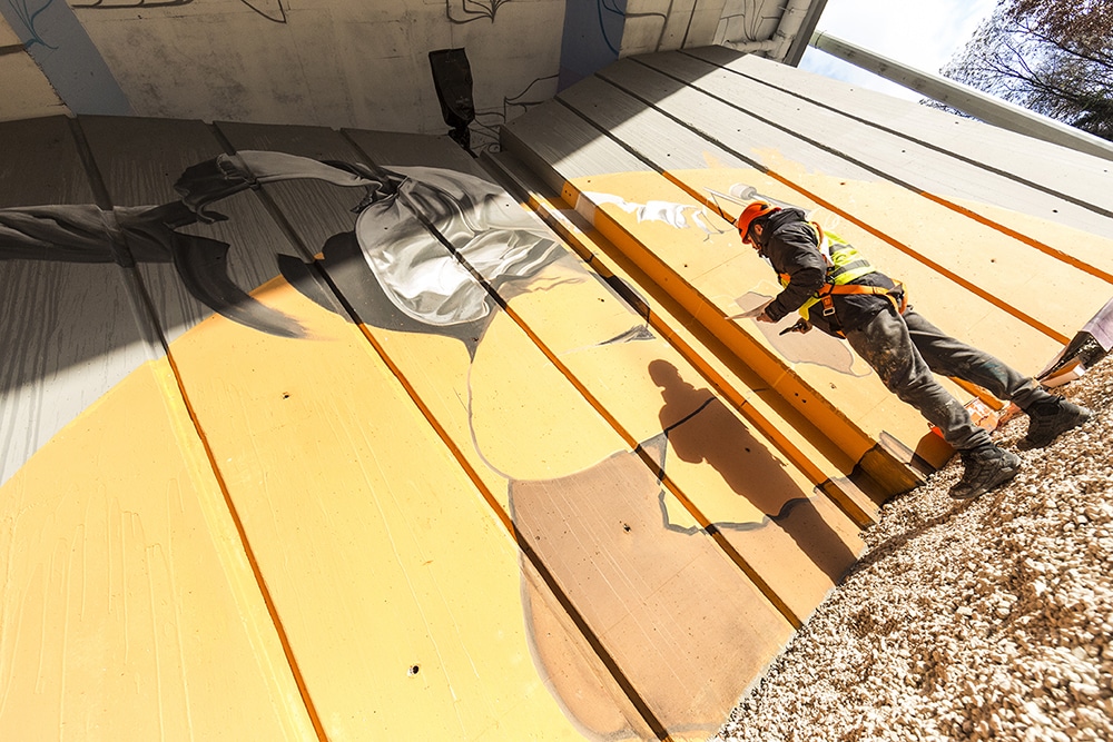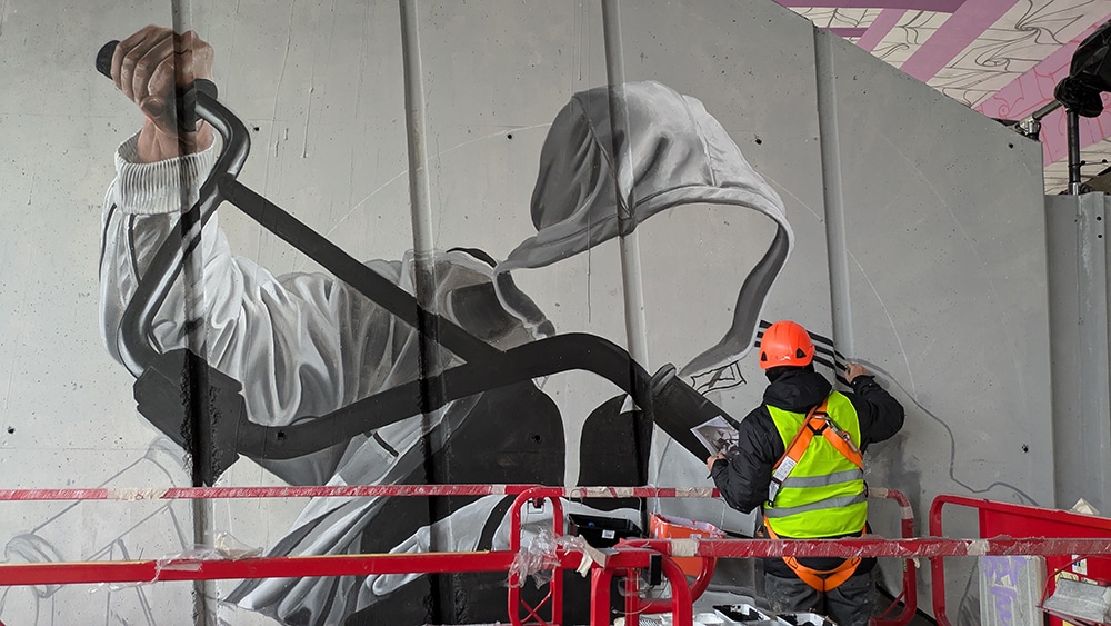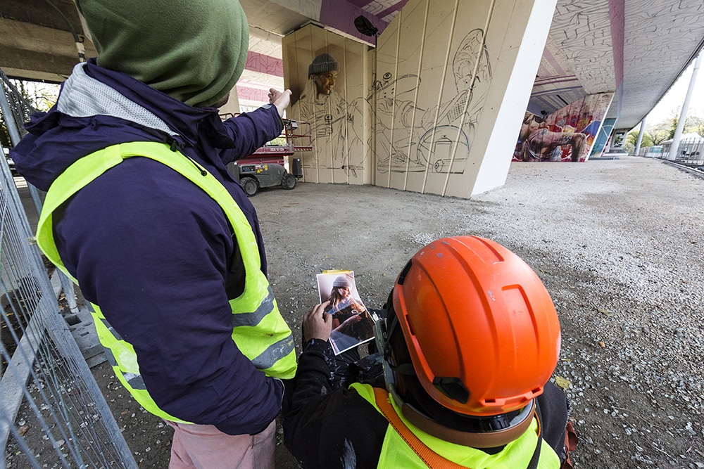 Fabian « Bane » Florin, artiste suisse né en 1982 à Coire, est reconnu pour ses œuvres en trompe-l’œil qui intègrent harmonieusement des figures réalistes dans des environnements urbains. Pour le projet « Le Spot », il a créé une fresque saisissante représentant une skateuse assise, donnant l’illusion qu’elle est adossée à un pilier. Cette œuvre illustre parfaitement la capacité de Bane à fusionner art et réalité, transformant des structures brutes en scènes vivantes et engageantes.