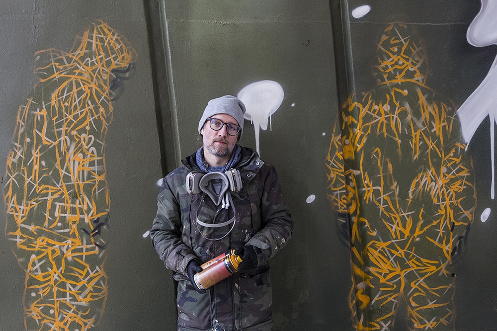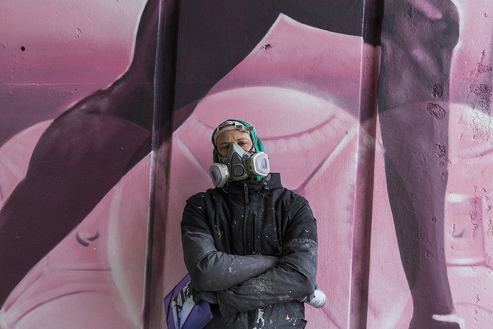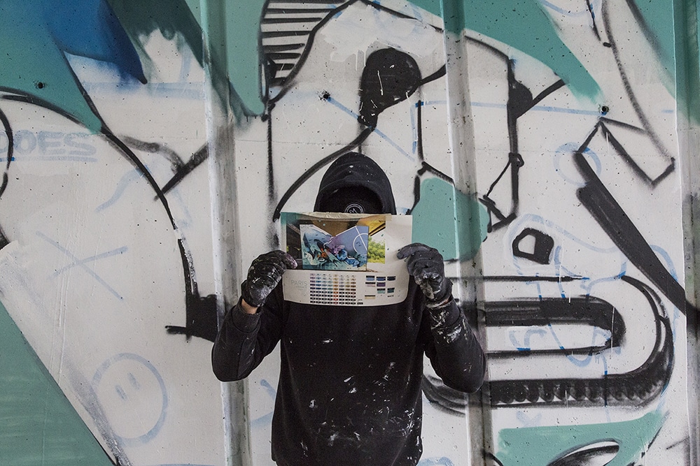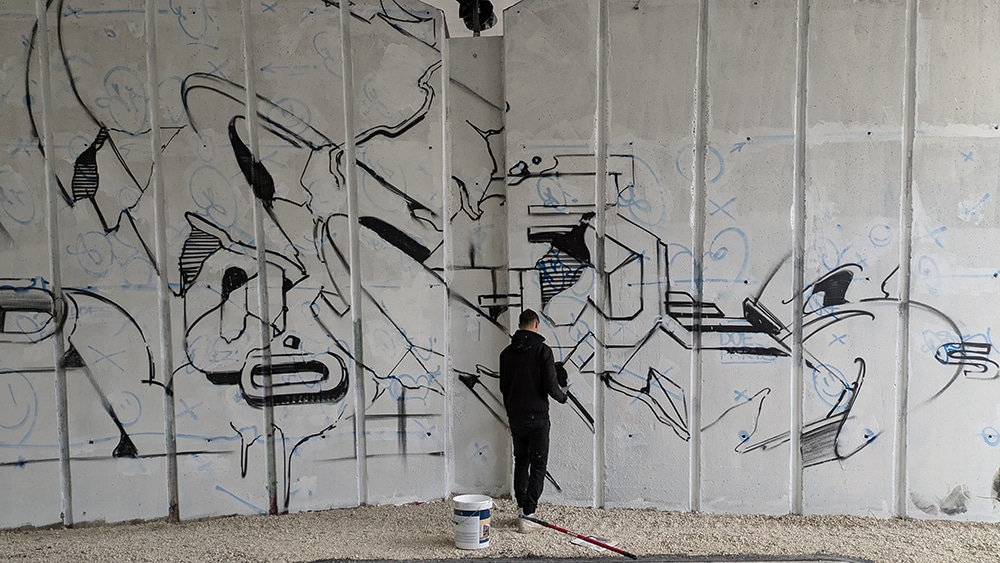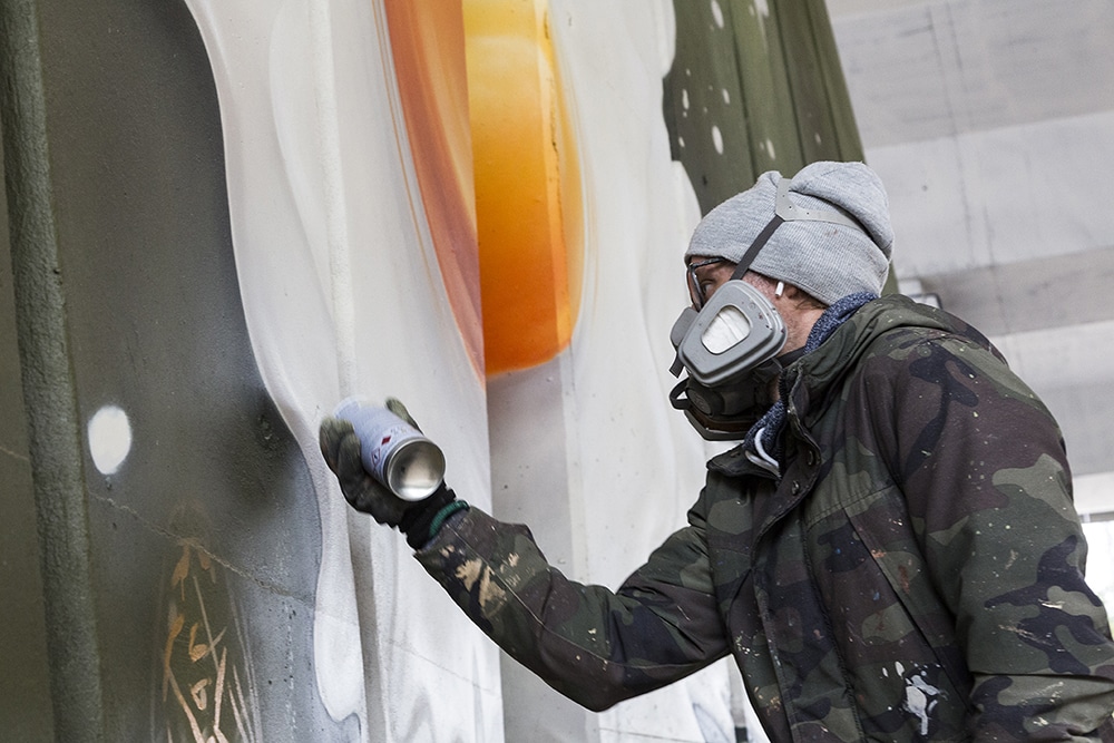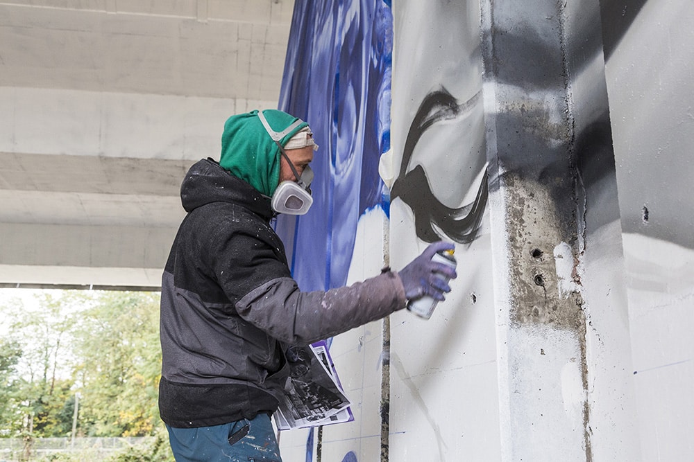 Fabian « Bane » Florin, artiste suisse né en 1982 à Coire, est reconnu pour ses œuvres en trompe-l’œil qui intègrent harmonieusement des figures réalistes dans des environnements urbains. Pour le projet « Le Spot », il a créé une fresque saisissante représentant une skateuse assise, donnant l’illusion qu’elle est adossée à un pilier. Cette œuvre illustre parfaitement la capacité de Bane à fusionner art et réalité, transformant des structures brutes en scènes vivantes et engageantes.