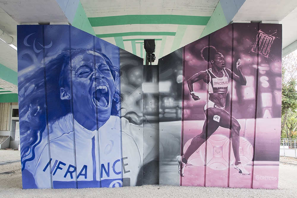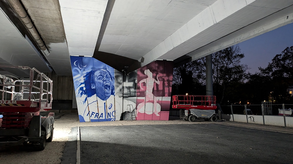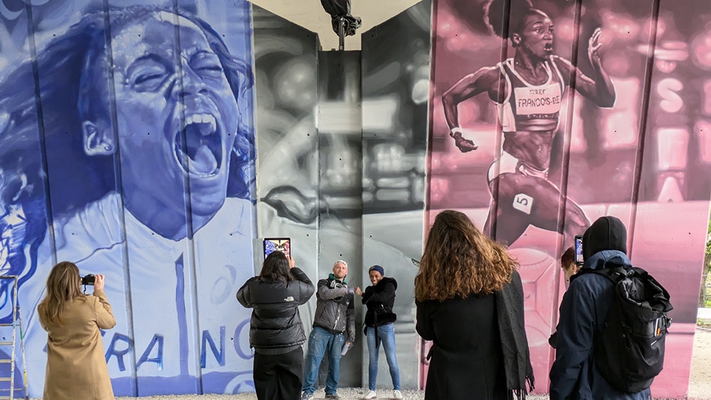 L’artiste Aero, maître du photoréalisme, a créé une fresque célébrant la force et la résilience des athlètes. Réalisée dans des tons monochromes de violet et bleu, l’œuvre met en scène une sprinteuse Mandy Francois-Elie, originaire de Joinville-le-Pont, en pleine action et exprimant un cri de triomphe, incarnant l’énergie et la détermination. Chaque détail, des expressions intenses aux mouvements dynamiques, illustre la puissance du sport comme vecteur d’inspiration et de dépassement de soi. Cette fresque, profondément symbolique, reflète l’esprit inclusif et sportif du « Spot« , tout en rendant hommage à la mixité et à l’effort humain.