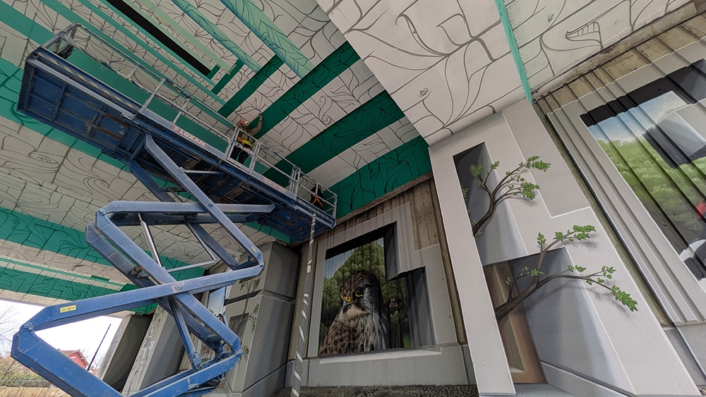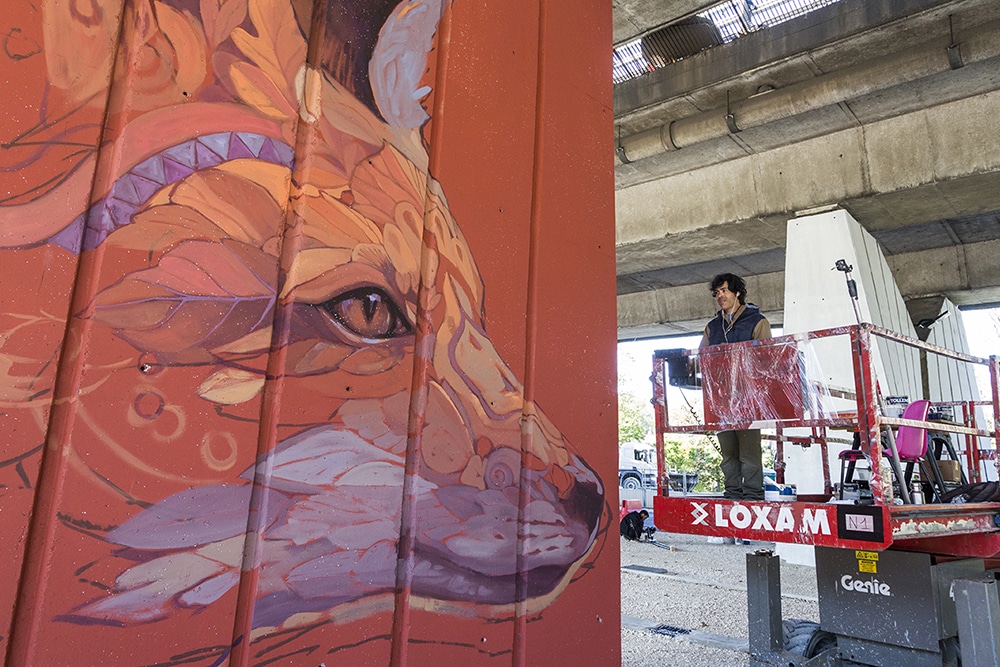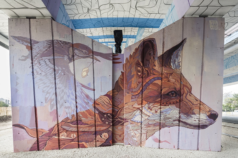 L’artiste Alegria del Prado a marqué son empreinte sur « Le Spot » avec deux fresques qui célèbrent la beauté de la nature et invitent les visiteurs à réfléchir à l’importance la préserver dans nos environnements urbain. Sur ces œuvres, un faucon et un renard prennent vie illustrés par son style artistique unique.