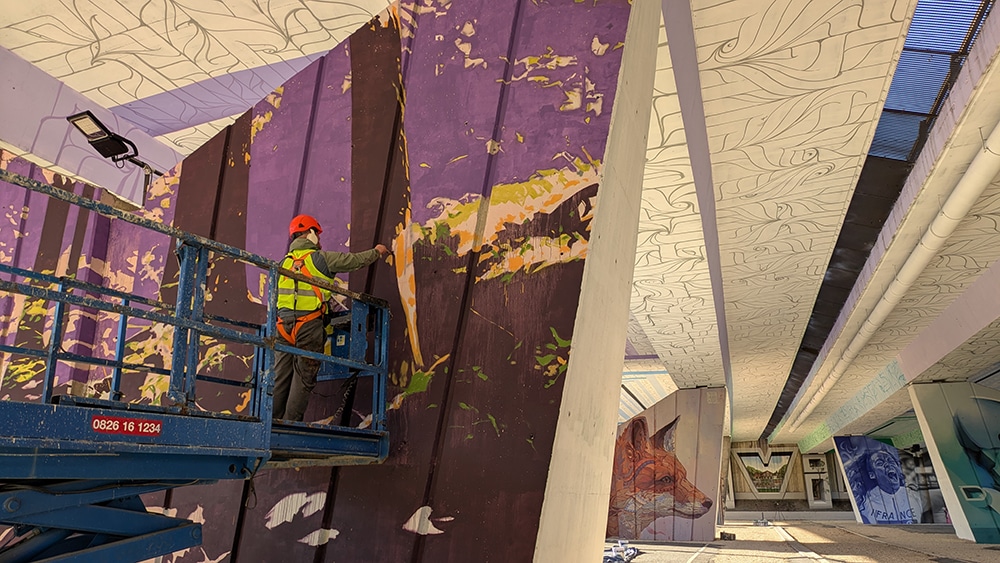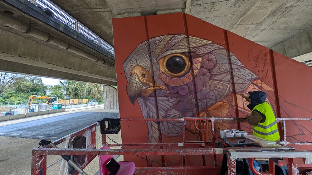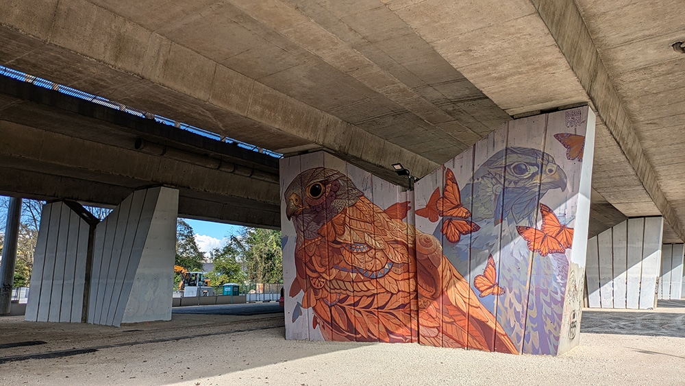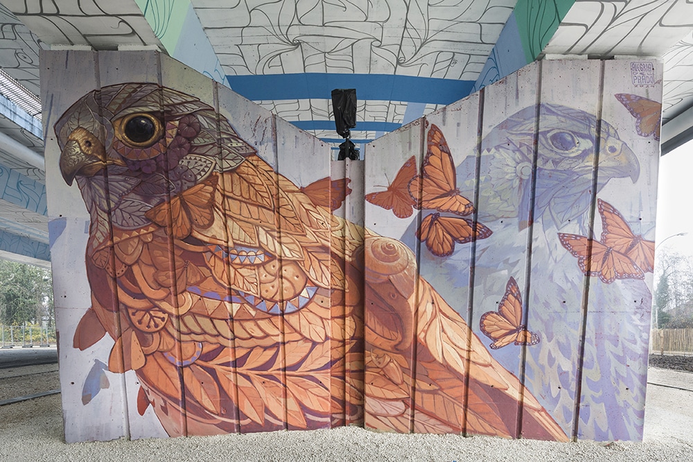 Les fresques se caractérisent par une palette de couleurs chaleureuses et apaisantes, mêlant des tons orangés et violets qui se fondent parfaitement dans l’architecture brute des piliers. Les animaux, entourés de papillons et d’éléments végétaux stylisés, symbolisent le lien fragile entre la ville et la biodiversité. Chaque détail des plumes ou du pelage est minutieusement travaillé, évoquant à la fois le réalisme et une esthétique presque onirique.