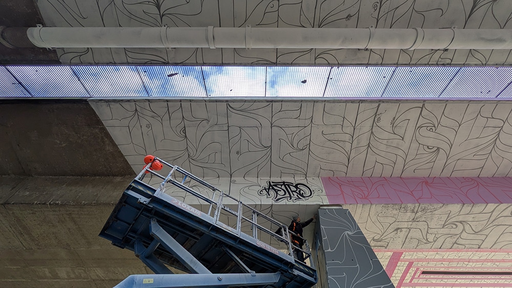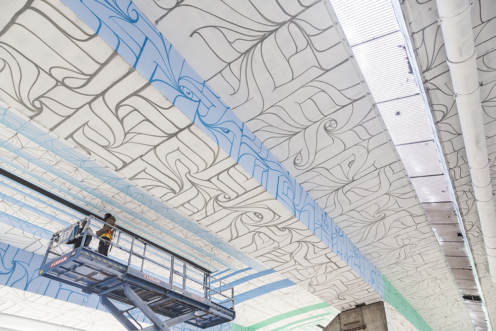 L’artiste Astro, originaire de Charenton-le-Pont, a transformé le plafond de « Le Spot » en une fresque monumentale. Reconnu pour ses compositions graphiques jouant sur les illusions d’optique, Astro a recouvert les structures bétonnées de motifs organiques et hypnotiques. Alternant courbes fluides et entrelacements complexes, il crée une œuvre qui capte le regard et dynamise l’ensemble de l’espace.
