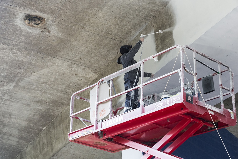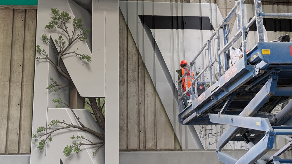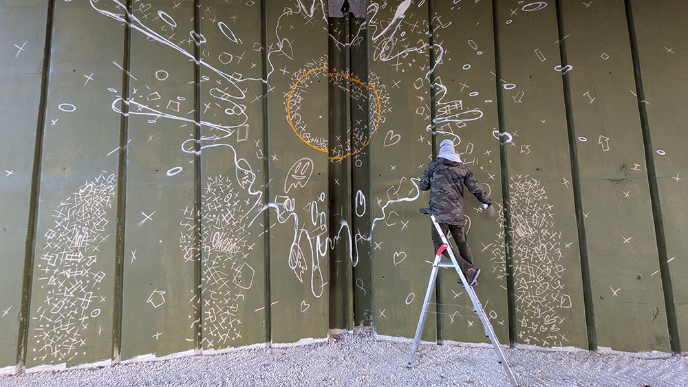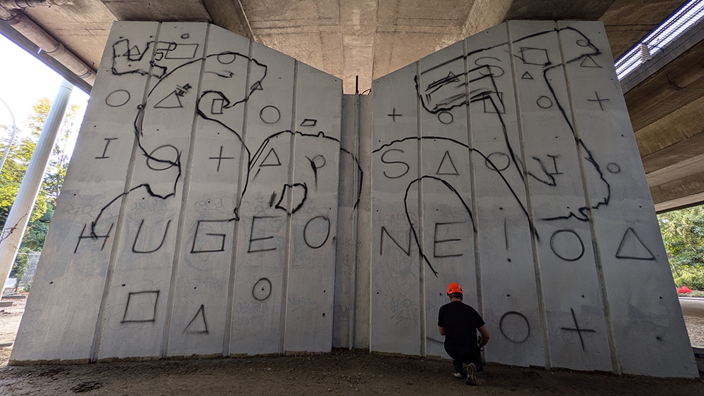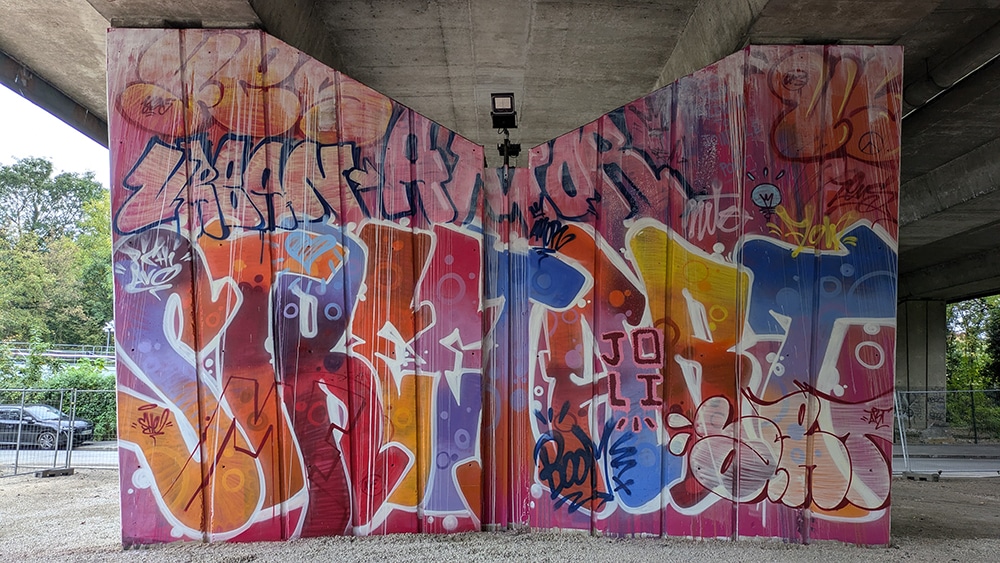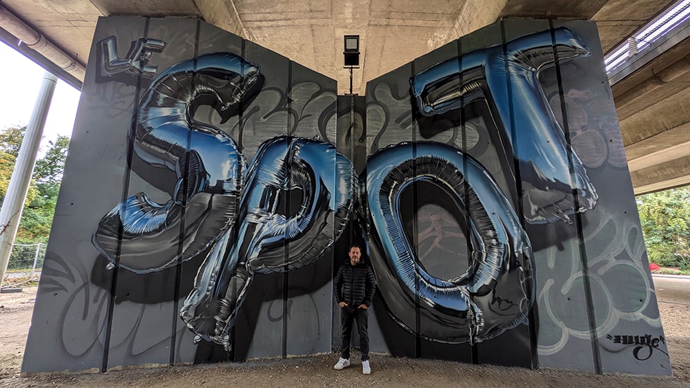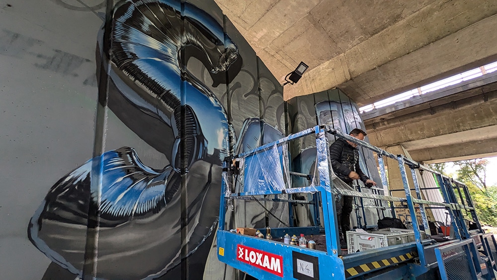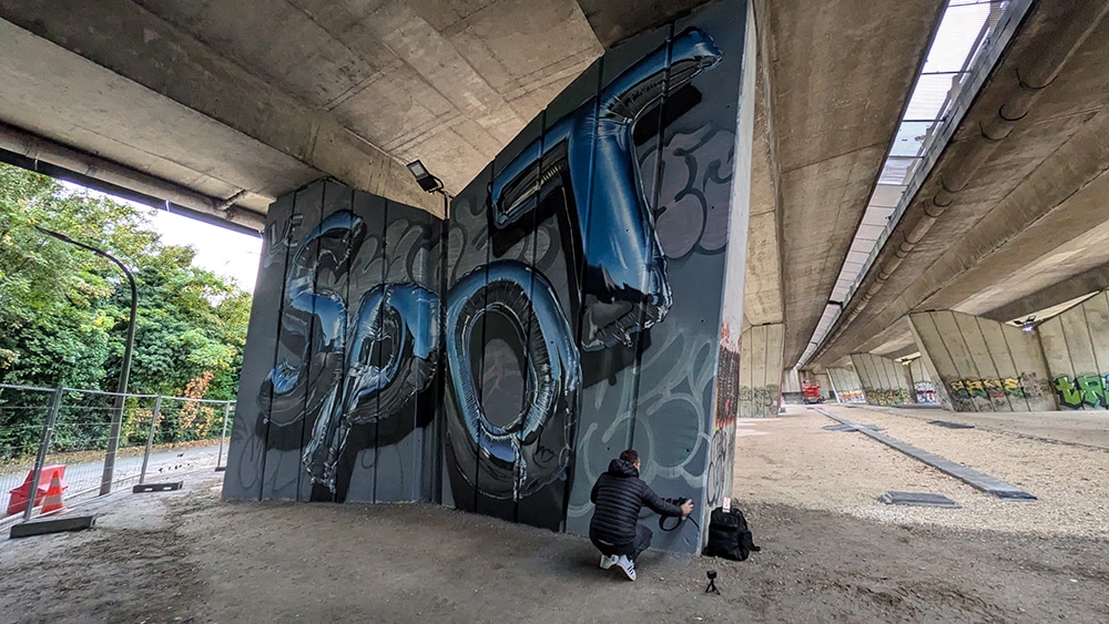Sur l’un des murs principaux du site, Huge a réalisé une fresque spectaculaire représentant le mot « Spot », écrit en lettres argentées en forme de ballons d’hélium. Ce choix artistique, Fidèle à son style, mêlant légèreté et monumentalité, s’inscrit parfaitement dans l’esprit du projet. Les ballons, symboles de fête et de légèreté, contrastent avec le cadre brut et industriel de l’autoroute, tout en attirant l’attention sur le renouveau et la transformation du lieu.