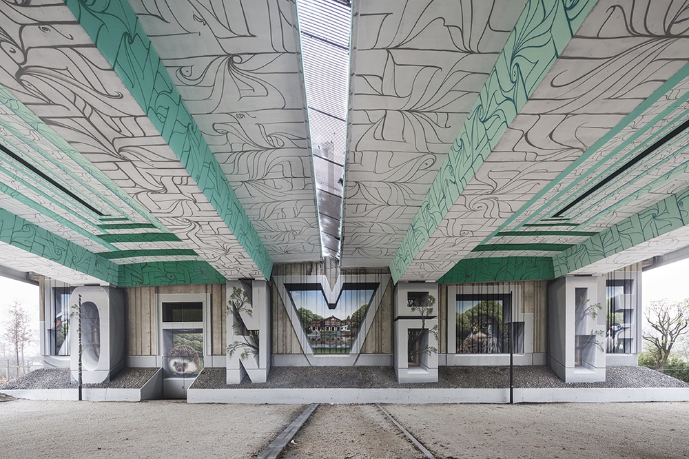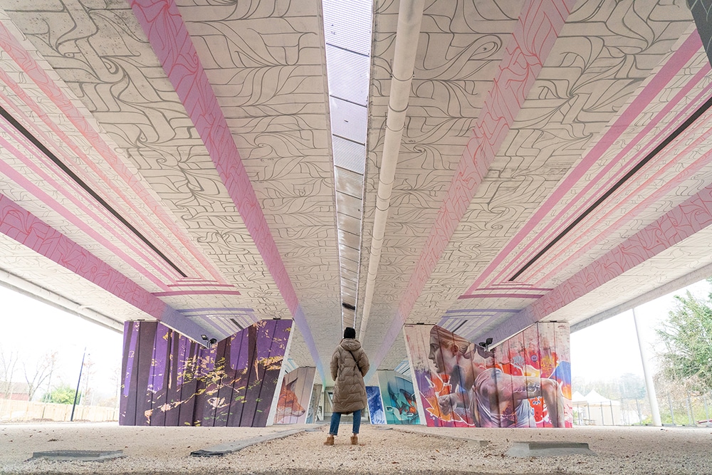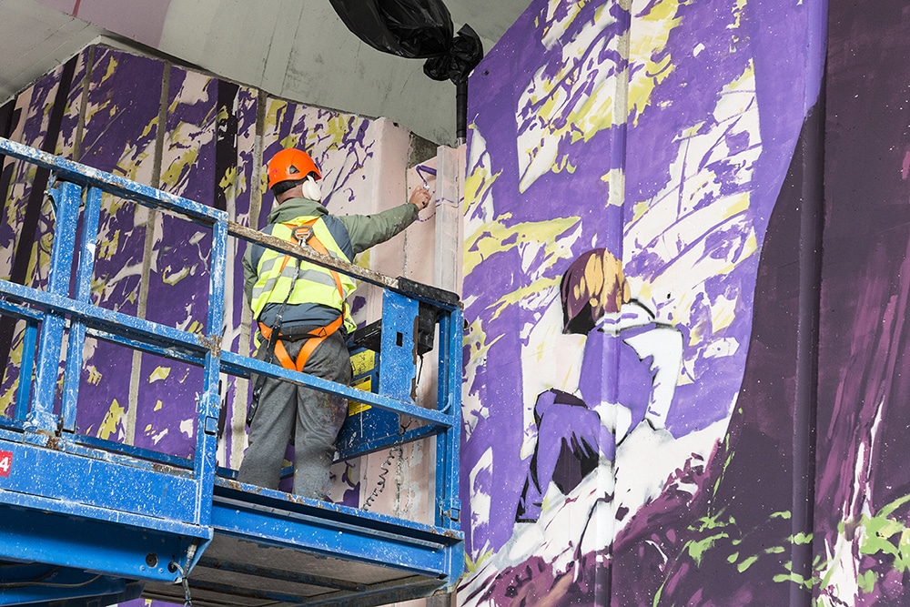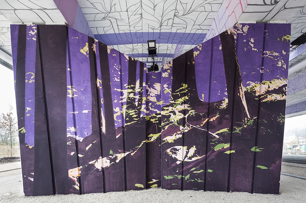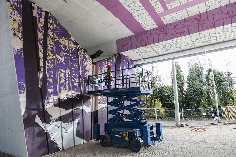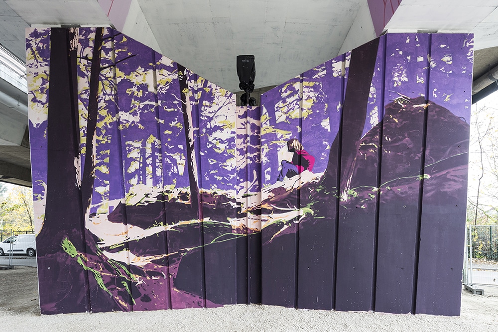 L’artiste Nean a apporté une touche poétique au « Spot » avec deux fresques immersives représentant une forêt baignée de lumière violette, rehaussée de nuances de vert et de jaune. Ces œuvres, mêlant réalisme et abstraction, capturent la sérénité et le mystère des paysages naturels tout en intégrant une silhouette humaine perchée sur une roche, symbolisant la connexion entre l’homme et son environnement. Les fresques de Nean transforment les piliers en fenêtres ouvertes sur la nature, offrant une pause contemplative au cœur de l’espace urbain et illustrant parfaitement la philosophie du « Spot » : réconcilier art, nature et ville.