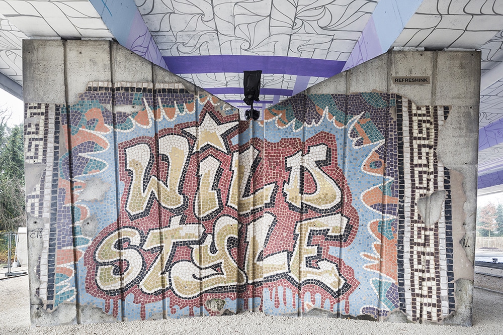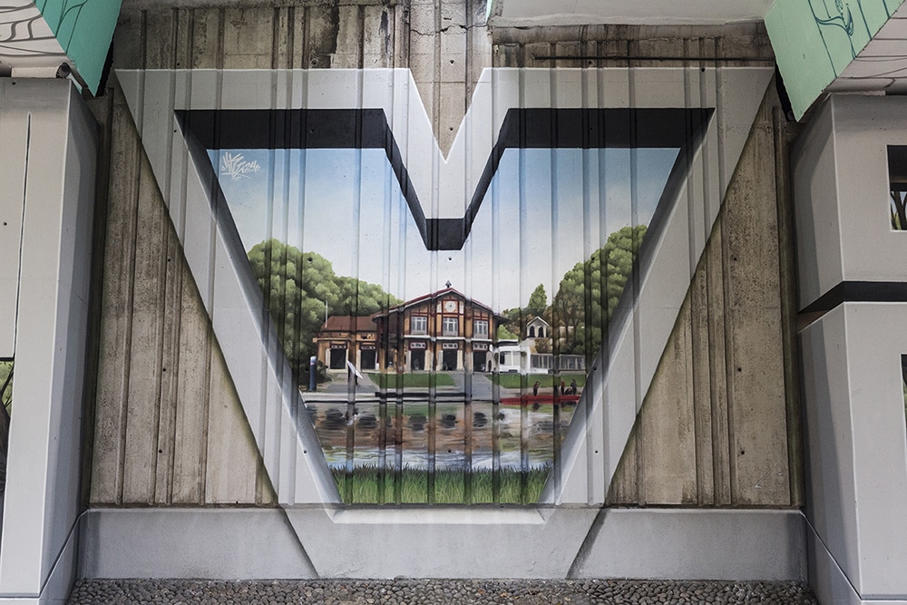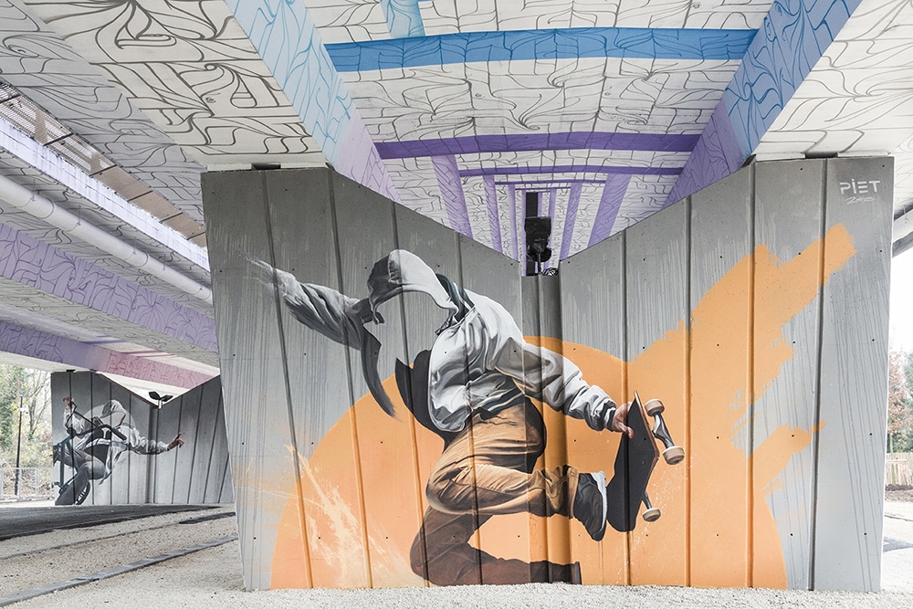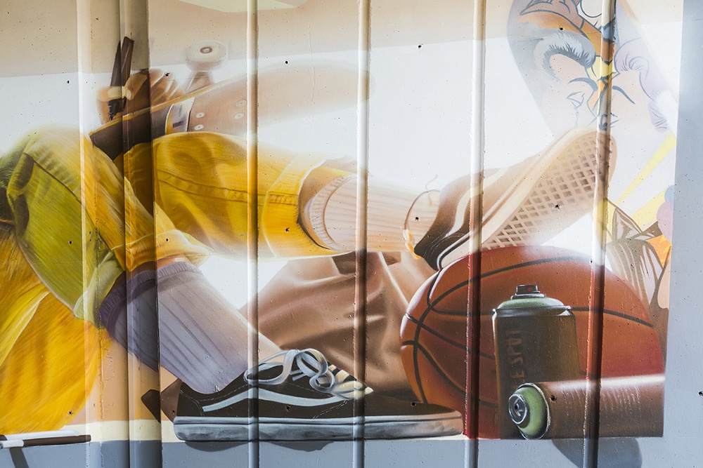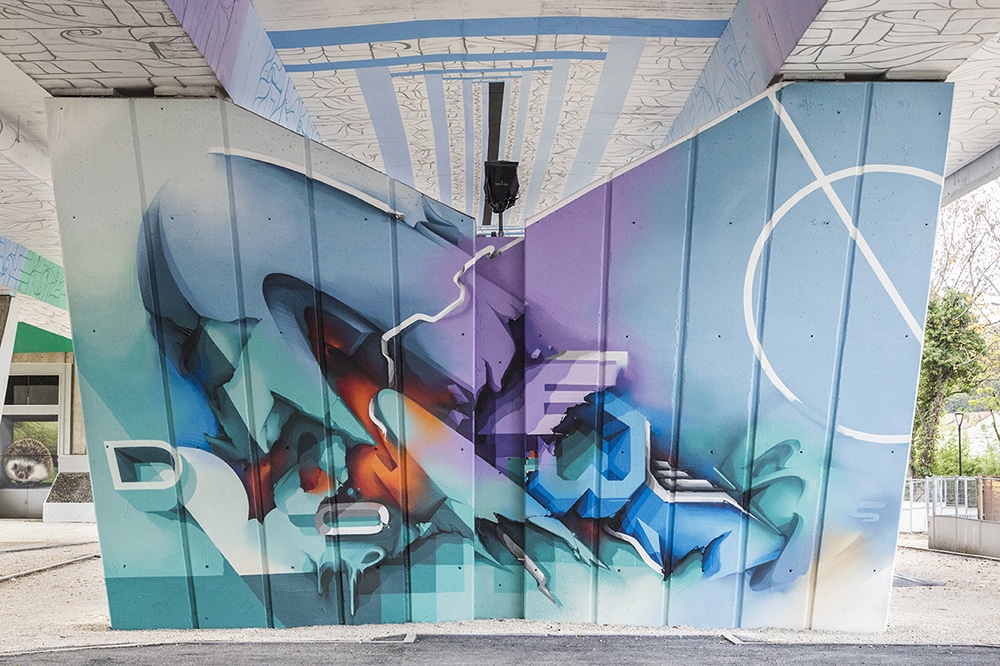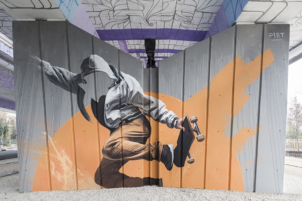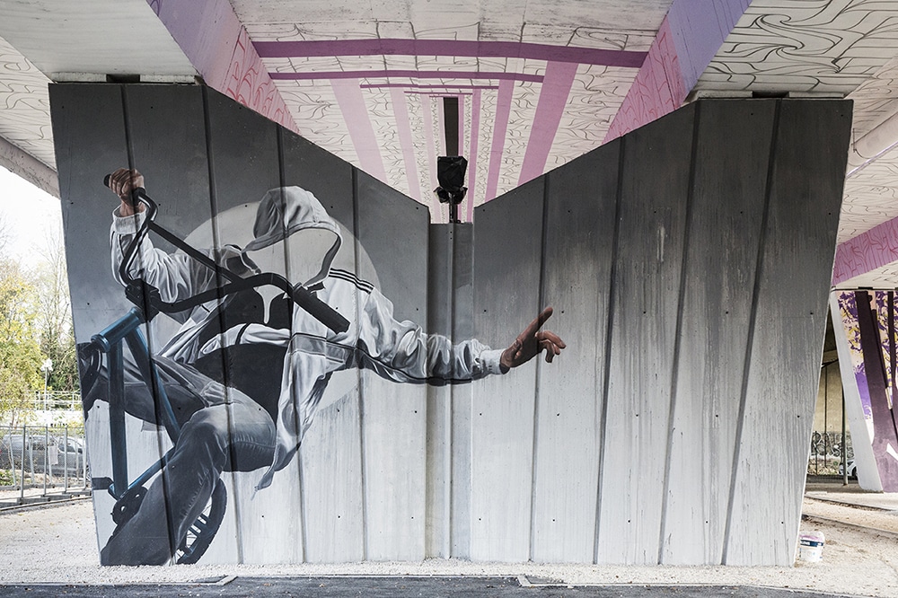 Piet Rodriguez, célèbre pour son style réaliste et précis, a créé deux fresques illustrant l’énergie des sports urbains. Un skateur en plein grab et un rider sur son bmx exécutant une figure acrobatique prennent vie sur les piliers du « Spot ». Les personnages, peints avec un souci du détail remarquable, se détachent sur des arrière-plans géométriques colorés, qui ajoutent une touche contemporaine et graphique. Ces fresques, véritables hommages au mouvement et à la créativité, s’inscrivent pleinement dans l’esprit du projet en établissant un lien fort entre l’art, le sport et l’espace urbain.